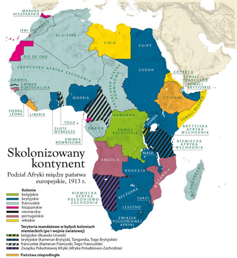 Mapa kolonii. W 1913 r. dwoma największymi imperiami w Afryce były Francja (niemal 11 mln km kw. posiadłości) i Wielka Brytania (ok. 8,7 mln), daleko za nimi szły Niemcy (ok. 2,6 mln), Portugalia (ok. 2,1 mln), Belgia (ok. 2 mln) i Włochy (ok. 1,8 mln km kw.). Relatywnie niewielkie posiadłości (niecałe 300 tys. km kw.) miała także Hiszpania. Finalna mapa kolonialnego podziału została ukształtowana po I wojnie światowej, kiedy to na skutek porażki Niemiec przejęto także ich zamorskie zdobycze (formalnie jako terytoria mandatowe). Te podziały zasadniczo przetrwały do czasów dekolonizacji i są w dużej mierze podstawą współczesnych granic państw afrykańskich. Wyjątkiem był podbój Etiopii przez Włochy (1935–41), który jednak traktujemy jak część II wojny światowej, a nie ekspansję kolonialną.