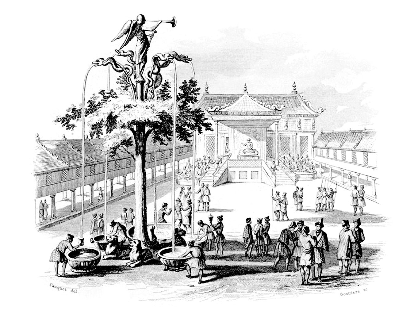 Spożywali oni wspólnie posiłki doprawione orientalnymi przyprawami, a często zakrapiane alkoholem. W stolicy imperium mongolskiego, mieście Karakorum, znajdowała się zaprojektowana przez francuskiego złotnika Guillauma Bouchiera Studnia Srebrnego Drzewa. Cztery złote węże owinięte wokół pnia rozlewały napój alkoholowy popularny w regionie, którego kierunek wskazywały. Wąż skierowany na północ (ku dzisiejszej Mongolii i Rosji) rozlewał ajrag, sfermentowane mleko końskie; wino gronowe płynęło z węża skierowanego na południe (Bliski Wschód); miód pitny z zachodniego (Europa); wino ryżowe ze wschodniego (Chiny).