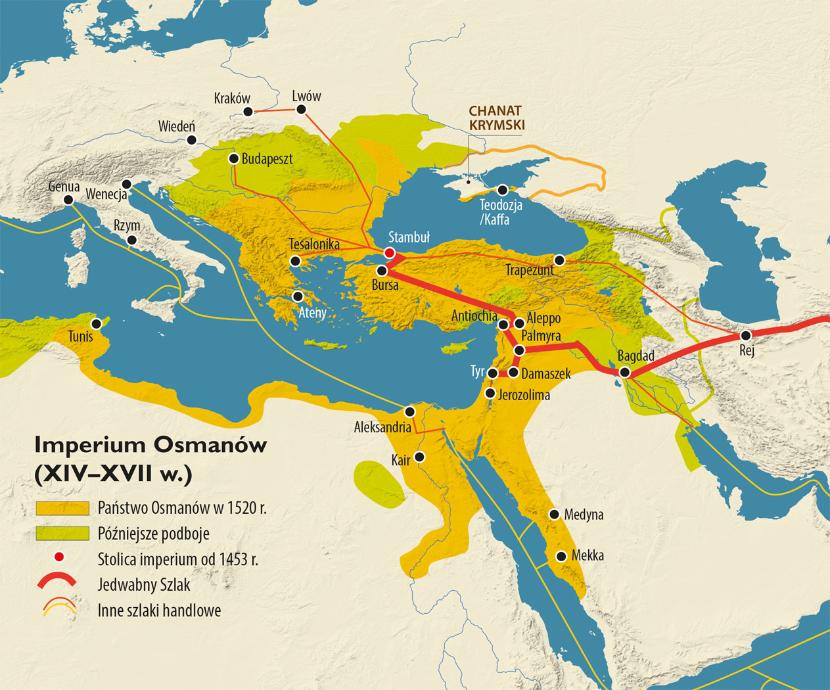 Władztwo Osmana. Rosnące zapotrzebowanie na jedwab w świecie chrześcijańskim miało ogromny wpływ na przemiany polityczne i społeczne w Anatolii i na Bliskim Wschodzie. Dwa potężne państwa muzułmańskie, których początki sięgają późnego średniowiecza, Imperium Osmańskie (XIV–XX w.) i imperium safawidzkie (XVI–XVIII w.), istotną część dochodów uzyskiwały właśnie dzięki lukratywnemu handlowi wspomnianą tkaniną i innymi dobrami transportowanymi różnymi odcinkami Jedwabnego Szlaku.