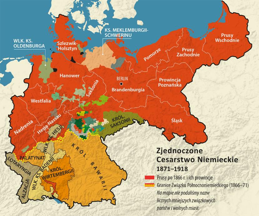 Spuścizna cesarskiej Rzeszy. Materialnych śladów cesarskich Niemiec (1871–1918) nie trzeba szukać daleko. Wystarczy pojechać do Poznania i spojrzeć na usytuowany w sercu miasta monumentalny zamek Wilhelma II bądź odwiedzić wrocławską Halę Stulecia, która w 1913 r., obok pomnika w stulecie zwycięstwa w bitwie pod Lipskiem, była architektonicznym ukoronowaniem jubileuszu niemieckiej walki przeciw napoleońskiej okupacji. Dla wytrawnych pozostają ślady tzw. wież Bismarcka, rozsiane na Dolnym Śląsku, Pomorzu czy Mazurach, gdzie w 2005 r. spór w Nakomiadach rozgrzał na chwilę ogólnopolską dyskusję o granicach tolerancji wobec obcego, hegemonialnego dziedzictwa Prus w obecnych granicach Polski.