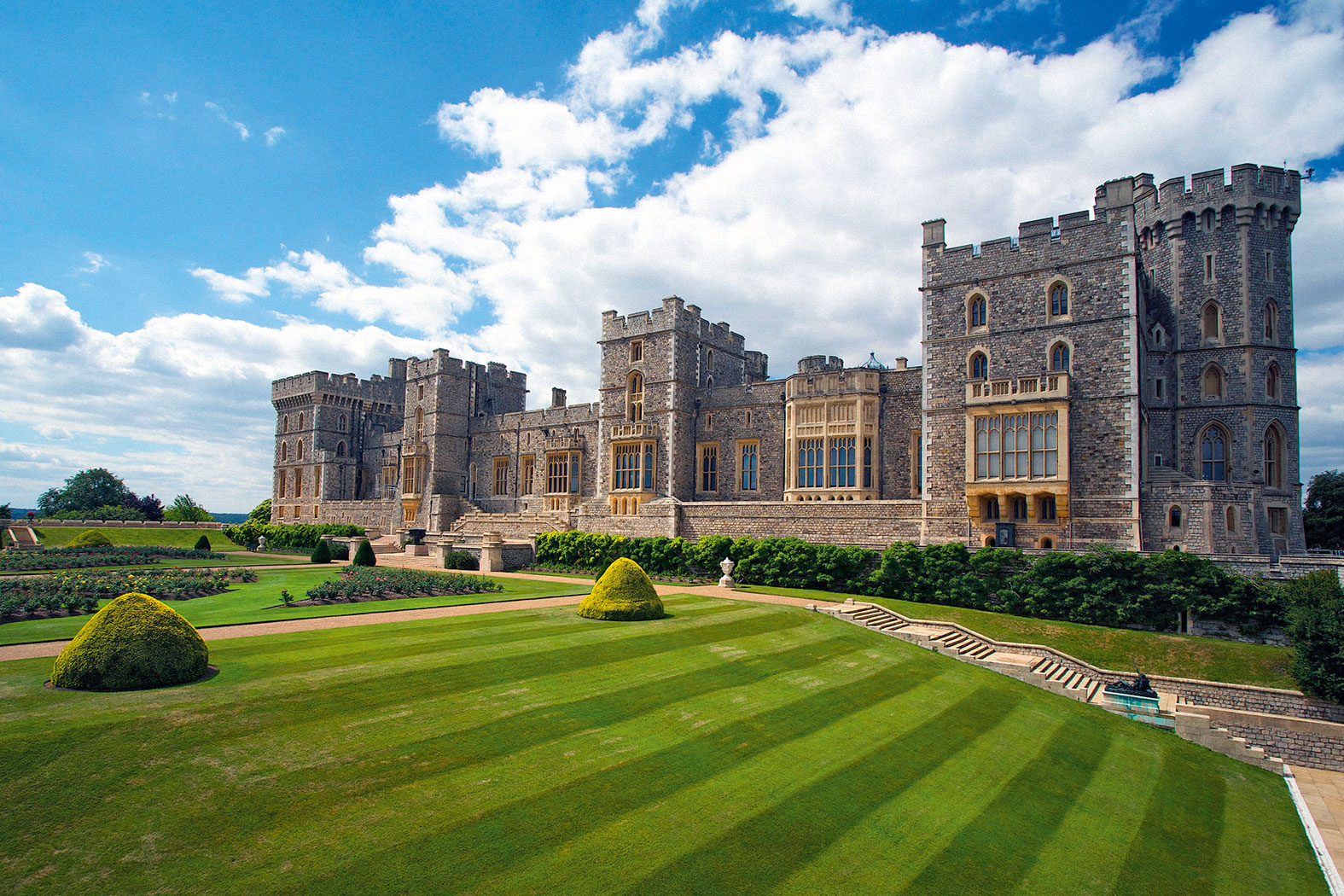 Usytuowany od zachodu zespół budynków dolnego dziedzińca obejmuje kaplicę św. Jerzego, jeden z najwybitniejszych przykładów tzw. stylu perpendykularnego typowego dla późnego gotyku w Anglii (art. s. 126). W obrębie górnego dziedzińca znajdują się m.in. prywatne pokoje rodziny królewskiej oraz tzw. State Apartments, czyli paradne apartamenty, gdzie Elżbieta II spędza weekendy, gości polityków, dyplomatów i inne osoby publiczne, uczestniczy w ceremoniach nadawania tytułów szlacheckich, wręcza ordery. Choć tę część zamku wzniesiono na średniowiecznych fundamentach, pochodzi ona z lat 20. XIX w. i jest wynikiem intensywnej przebudowy w stylu neogotyckim prowadzonej na zlecenie Jerzego IV przez architekta sir Jeffry’a Wyatville’a. Mury zwieńczono wówczas blankami, wieżami i wieżyczkami. By gmachowi nadać spójność ze starszymi murami, użyto m.in. pasującego do nich wapienia oolitowego, a do zaprawy dodano jak niegdyś drobiny krzemienia.