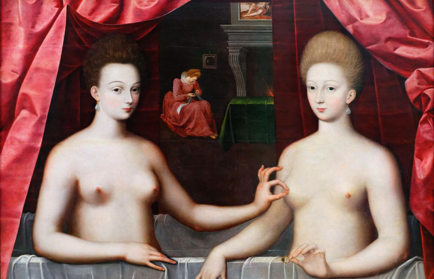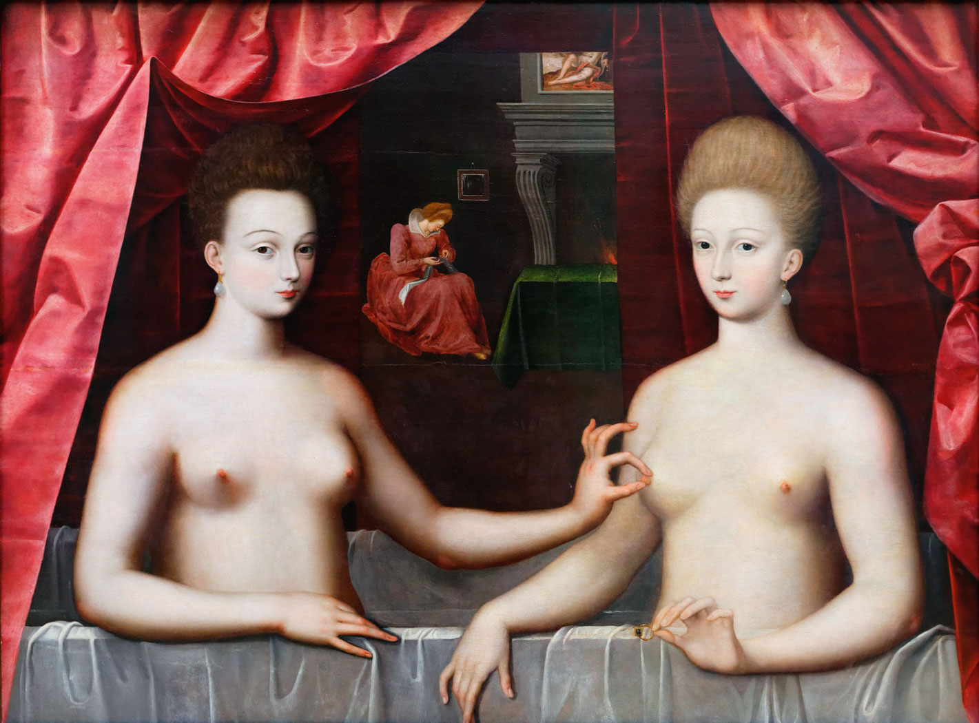 Kiedy artyści bywali anonimowi, czyli szkoła z Fontainebleau (XVI w.). Król Franciszek I niemal całe życie prowadził wojny. Najeżdżając Półwysep Apeniński, poznał renesansową sztukę włoską. Zaprosił do Francji malarzy: Rossa Fiorentina (1495–1540), który pokierował pracownią w Fontainebleau, oraz Francesca Primaticcia (1504–70). W ich kręgu działali twórcy włoscy i francuscy, najczęściej anonimowi. Z pracowni pochodzi erotyczny obraz „Gabriela d’Estrées i jej siostra księżna de Villars w kąpieli”. Przedstawia on kochankę króla Henryka IV, która szczypie w sutek swą siostrę Julienne d’Estrées. Może to być odczytane jako aluzja do ciąży i narodzin nieślubnego syna monarchy. W 2002 r. obraz został wykorzystany przez niemiecką Partię Zielonych w plakacie popierającym małżeństwa tej samej płci. W Polsce wariacje na temat dzieła stworzyła grupa Łódź Kaliska.