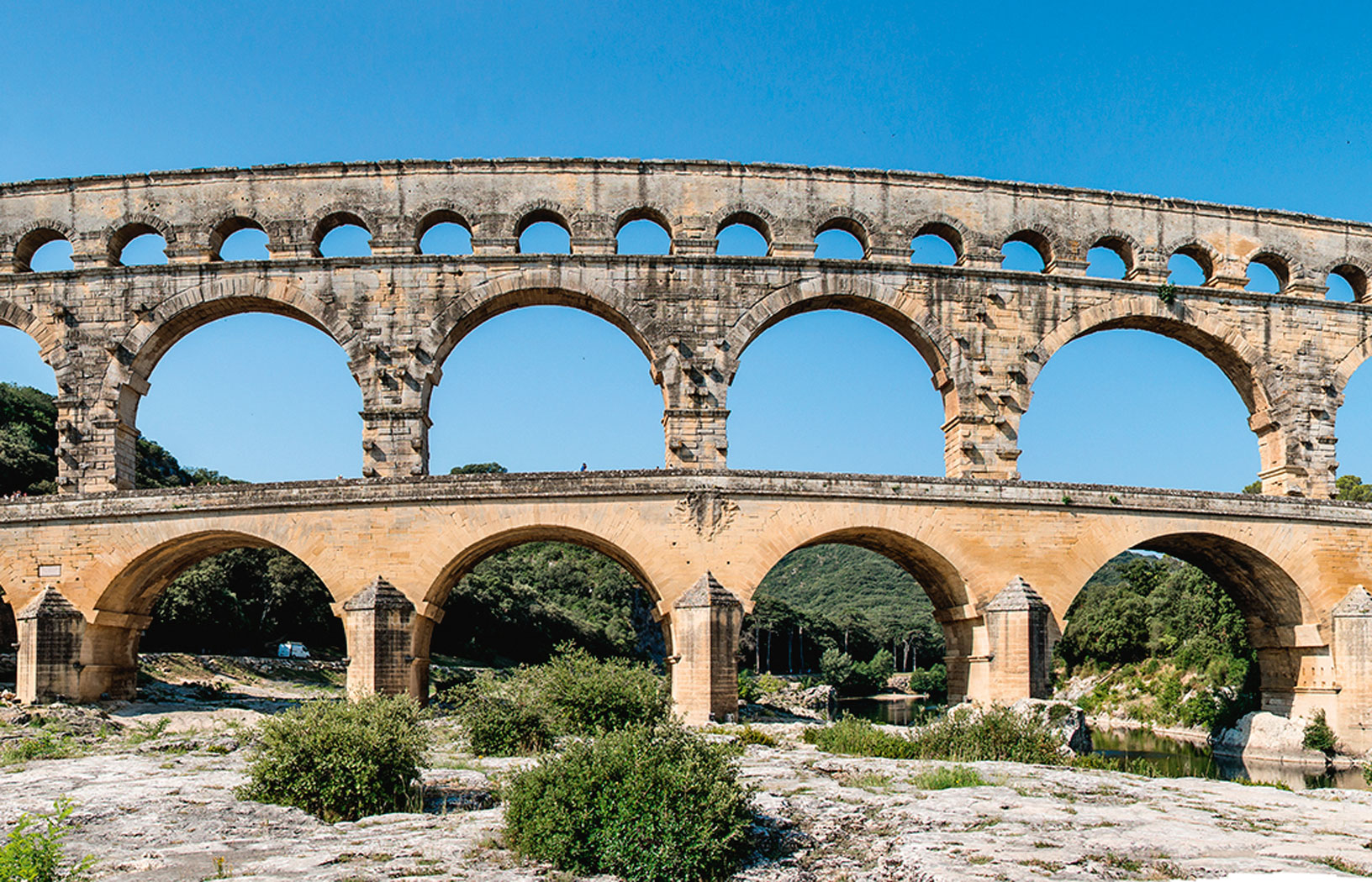 Akwedukt Pont du Gard oraz rzymski amfiteatr w Arles. Wspaniałość średniowiecznych oraz nowożytnych zabytków Francji często przysłania bogate architektoniczne dziedzictwo okresu rzymskiego. Jedną z najświetniejszych budowli antycznych jest akwedukt w dolinie rzeki Gard, niedaleko Nîmes w południowej części Francji. Wybudowany w latach 26–16 p.n.e. miał za zadanie dostarczać wodę ze źródeł w Uzès mieszkańcom ówczesnego Nemausus. W średniowieczu służył zaś jako most przy przekraczaniu rzeki. Istniejący do dziś odcinek ma ok. 270 m i jest to jeden z najlepiej zachowanych zabytków rzymskiej inżynierii na północ od Alp.