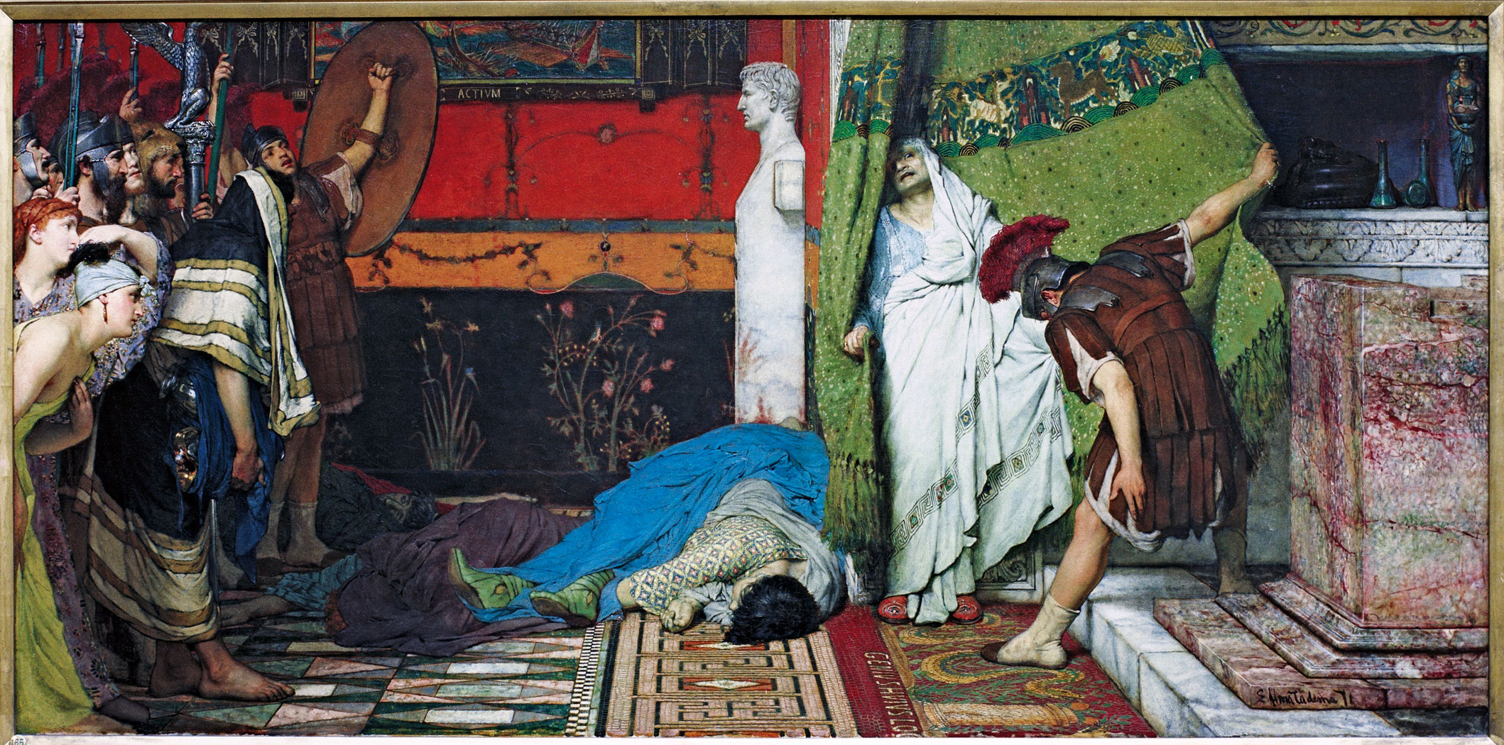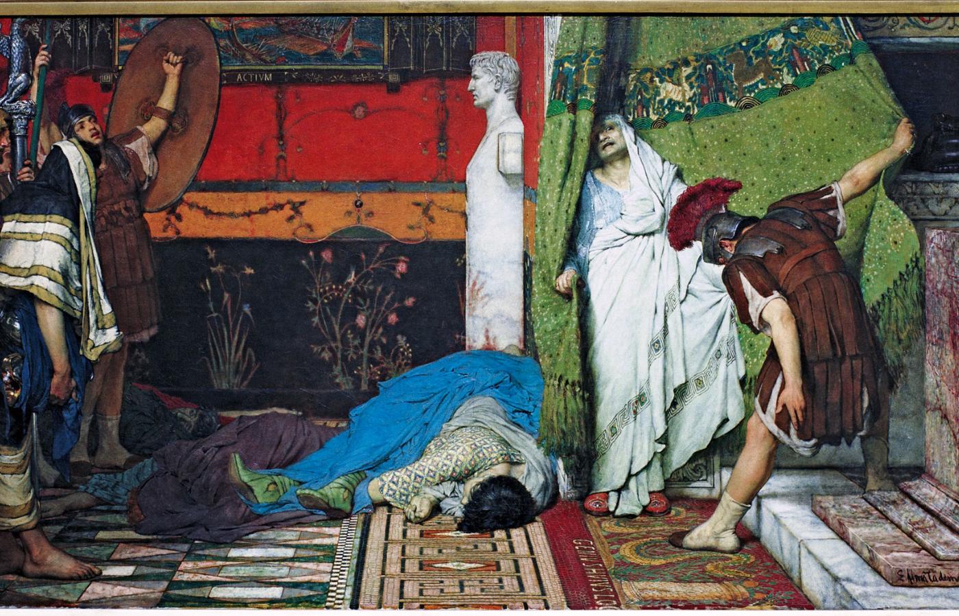 A wszystko zaczęło się 15 marca 44 r. p.n.e. od zabójstwa Cezara. Najsłynniejszy z morderców, Brutus, zadał ostateczny cios, a Cezar wyrzekł wtedy zdanie: „I ty synu” (a nie, jak chciałby Szekspir: „I ty Brutusie przeciwko mnie!”). Po tym zabójstwie walki wewnętrzne zakończyły się wiktorią Augusta pod Akcjum, jednak nad nowym jedynowładcą Rzymu wciąż wisiało widmo zamachu. Jak zauważył francuski historyk René Girard: „Wszyscy kolejni cesarze czerpią swoją siłę z cnoty ofiary, emanującej z bóstwa, którego imię noszą, pierwszego cezara, zamordowanego przez wielu morderców. Jak każda święta monarchia także imperium opiera się na deifikowanej ofierze zbiorowej”.