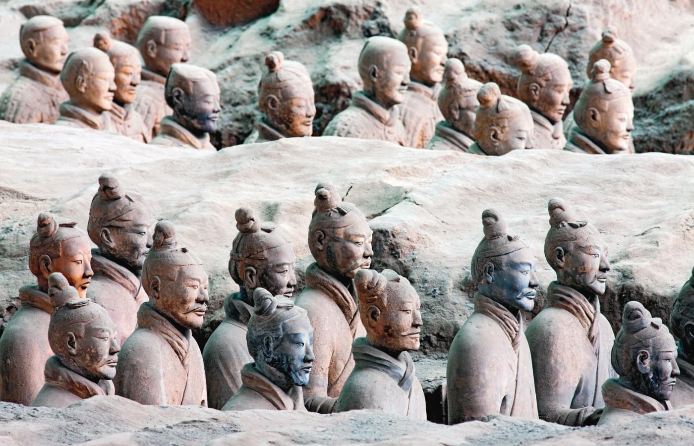 Żołnierze w szyku. Najbardziej spektakularnego odkrycia w historii archeologii Chin dokonano w 1974 r. Robotnicy kopiący studnie niedaleko miasta Lintong, stolicy okręgu w prowincji Shaanxi, natrafili na podziemną galerię kryjącą gliniane figury wojowników i koni naturalnych rozmiarów. Miejsce to znajdowało się zaledwie 1225 m na wschód od kurhanu Qin Shihuangdi (221–210 p.n.e.), było więc jasne, że chodzi tu o element kompleksu grobowego cesarza, jeden – jak się wkrótce okazało – z największych i najbogatszych na świecie. Szacuje się, że w kilku sektorach zakopano tu armię liczącą ok. 8 tys. figur żołnierzy, 520 koni zaprzężonych do 130 kwadryg i 150 wierzchowców.