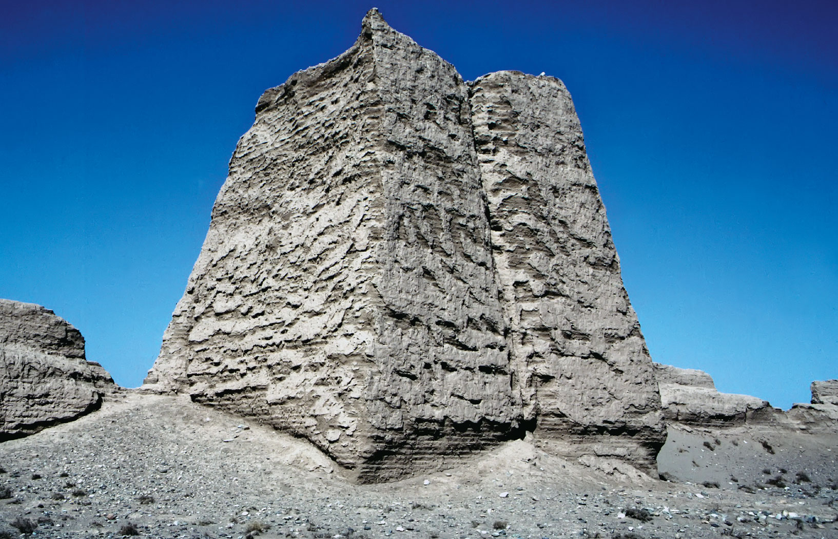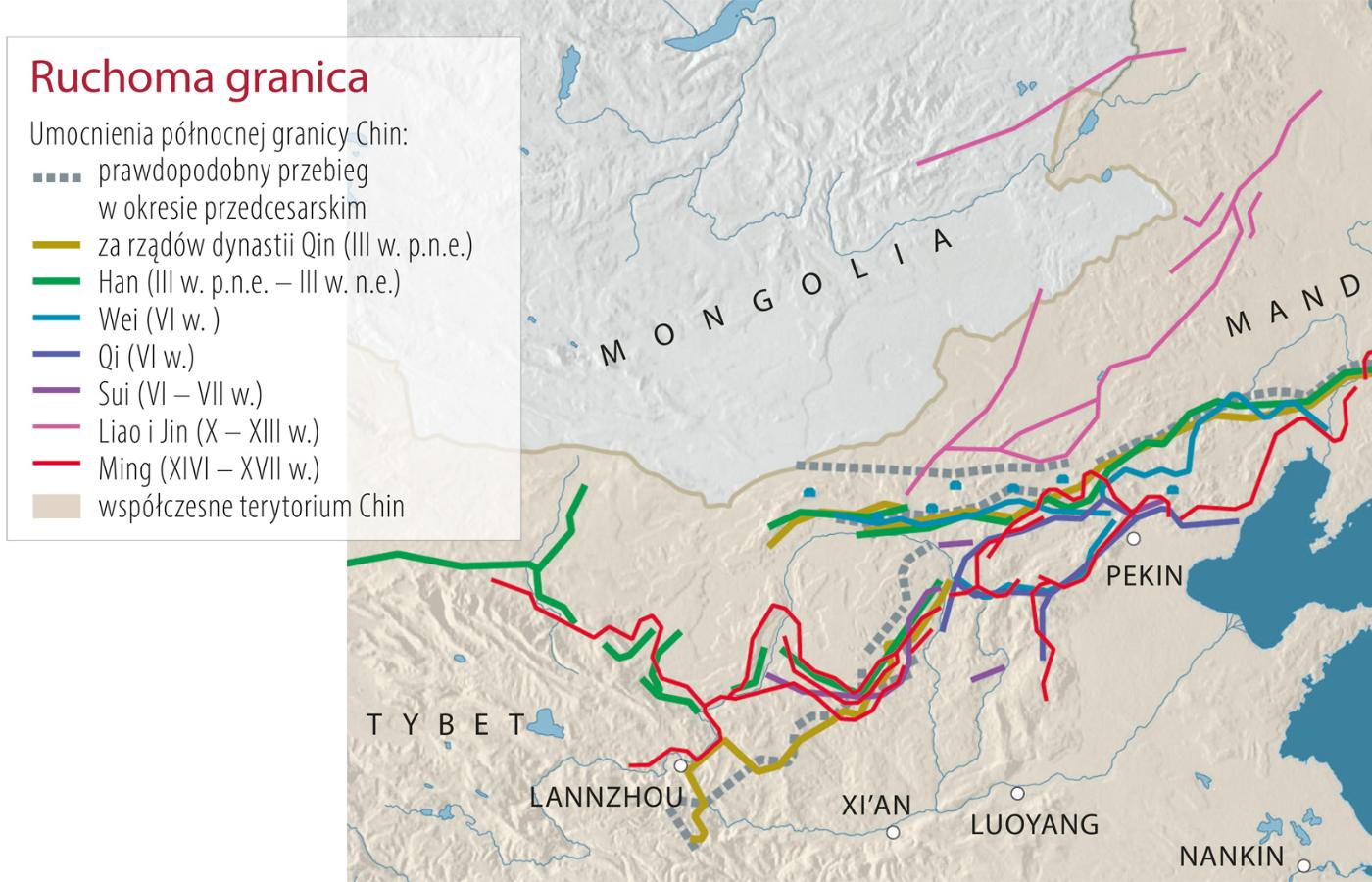 Konstrukcja. Popularny wizerunek chińskiego muru jest mocno mylący. Wijąca się malowniczo wśród szczytów wzgórz kamienna budowla to odcinek krótki i do tego szczególny. Powstał w XVI w., by osłaniać przedpole cesarskiej stolicy, toteż jego skala i standard wykonania są wyjątkowe. Pozostałe części muru, a także wszystkich jego poprzedników należałoby raczej nazywać wałami. Wznoszono je przy użyciu starej, stosowanej już w trzecim tysiącleciu p.n.e. techniki napełniania drewnianego szalunku ziemią i starannego ubijania. Posługiwano się dostępnym w okolicy budulcem, łącząc piasek ze składnikami organicznymi, jak słoma czy sitowie. Od zewnątrz wał licowano, na terenach wyżynnych kamieniami, a na nizinach faszynami lub gliną. Tą ostatnią, niekiedy w postaci suszonej lub wypalanej cegły. Trudno stwierdzić, jak rozpowszechniona była to praktyka. Do naszych czasów przetrwały najczęściej tylko resztki ziemnego rdzenia umocnień. Cegła i kamień, jeśli stanowiły ich odzienie, już dawno zostały zużyte przez okoliczną ludność.