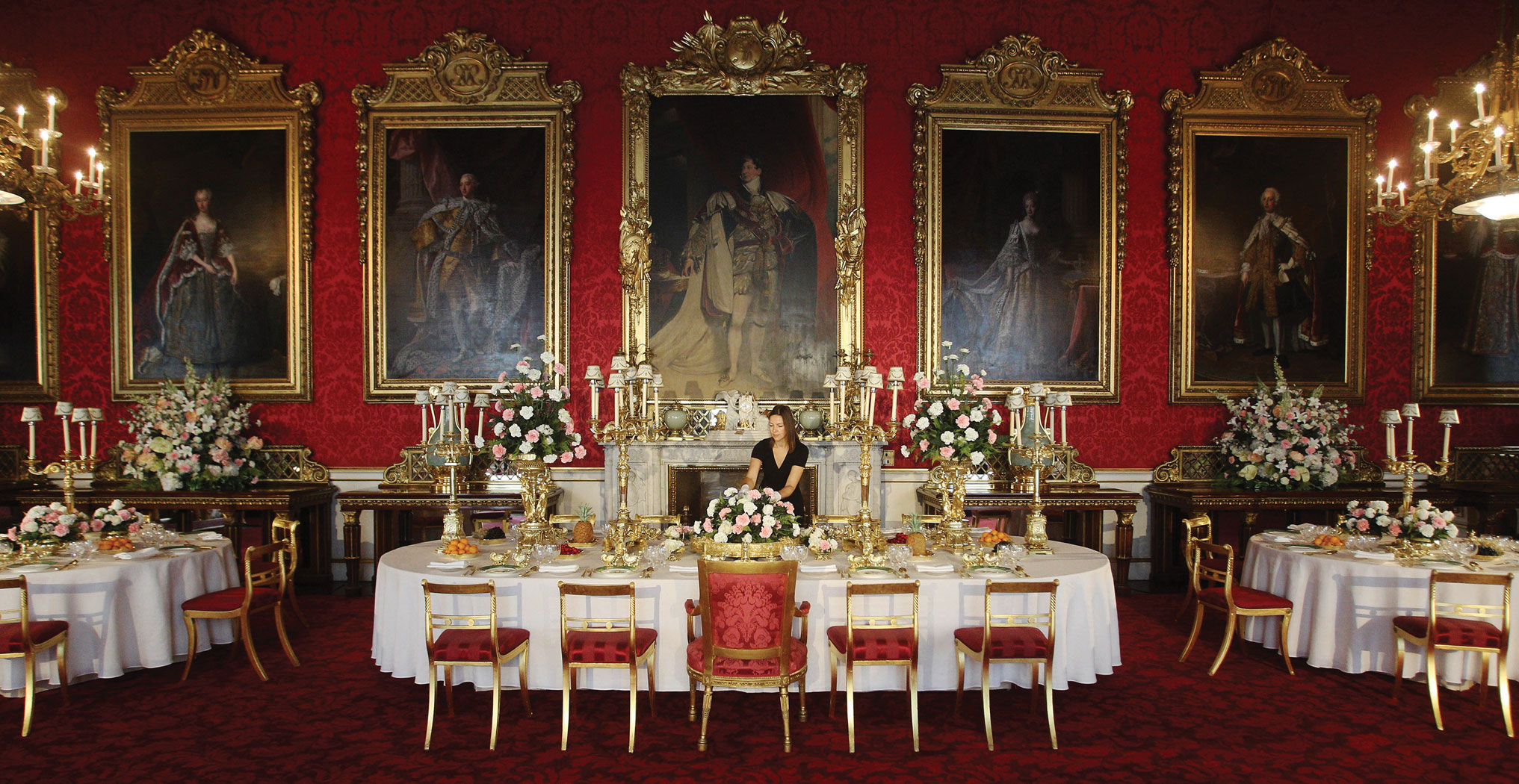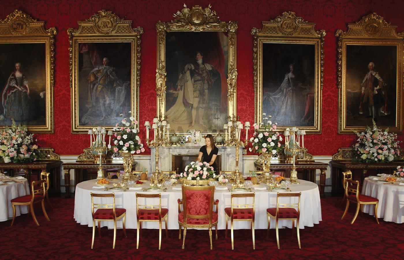 Goście na oficjalnym bankiecie. Prawdziwym wyzwaniem logistycznym były oficjalne bankiety państwowe, których pałac wydawał do 70 rocznie. Największym i najbardziej formalnym było doroczne spotkanie z korpusem dyplomatycznym akredytowanym przy Dworze Świętego Jakuba. Poza tym rząd, zgodnie z aktualnymi potrzebami, zwracał się do królowej, by podjęła w pałacu tych czy innych gości. Wtedy do pracy przystępowało biuro jej Lorda Szambelana. Uzgadniano termin, program i oczekiwania stron, co trwało miesiącami. Potem – ustalano listę uczestników i planowano ich rozmieszczenie przy stole.
