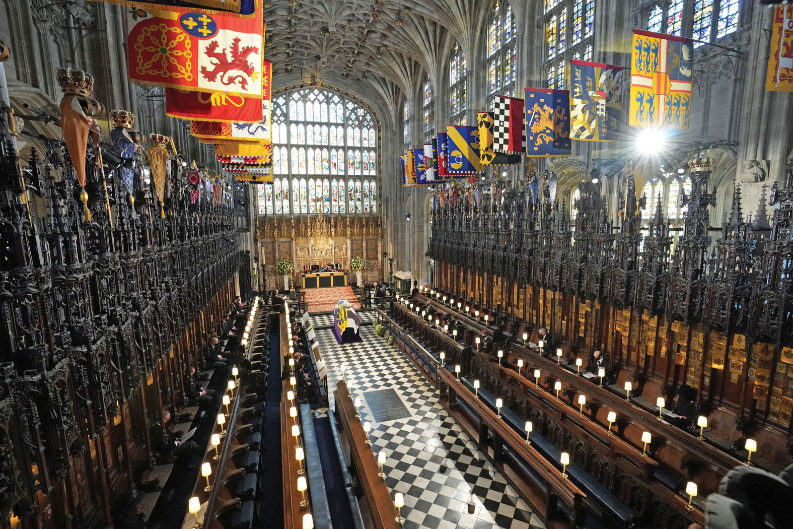 Budowę kaplicy dla rycerzy Orderu Podwiązki rozpoczęto z fundacji Edwarda IV z dynastii Yorków w 1475 r., a zakończono ponad 50 lat później w 1528 r. za panowania Tudorów. Budynek ma prosty plan krzyża z dwiema bocznymi nawami od południa i północy, które przedłużają się za prezbiterium i pozwalają je obejść dookoła. Transept, czyli nawa poprzeczna, jest zakończony wielokątnymi apsydami kaplic (Rutland Chantry i Bray Chantry), których mniejsze siostry znajdują się w części frontowej budynku. Typowe dla stylu strzelistego okna są bardzo duże, a wypełnia je odkuta z kamienia geometryczna dekoracja.