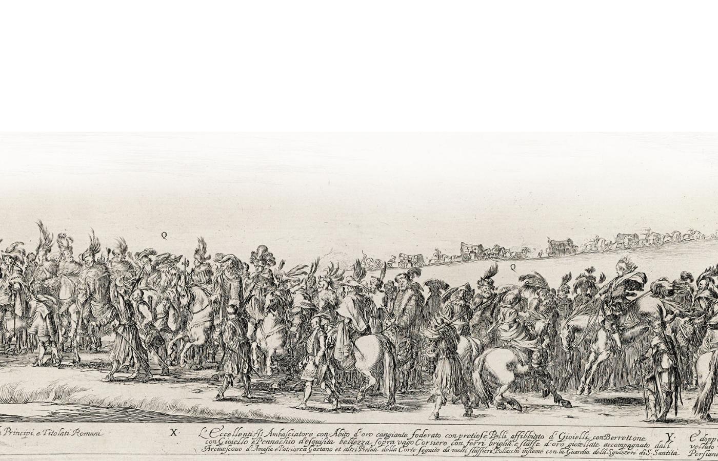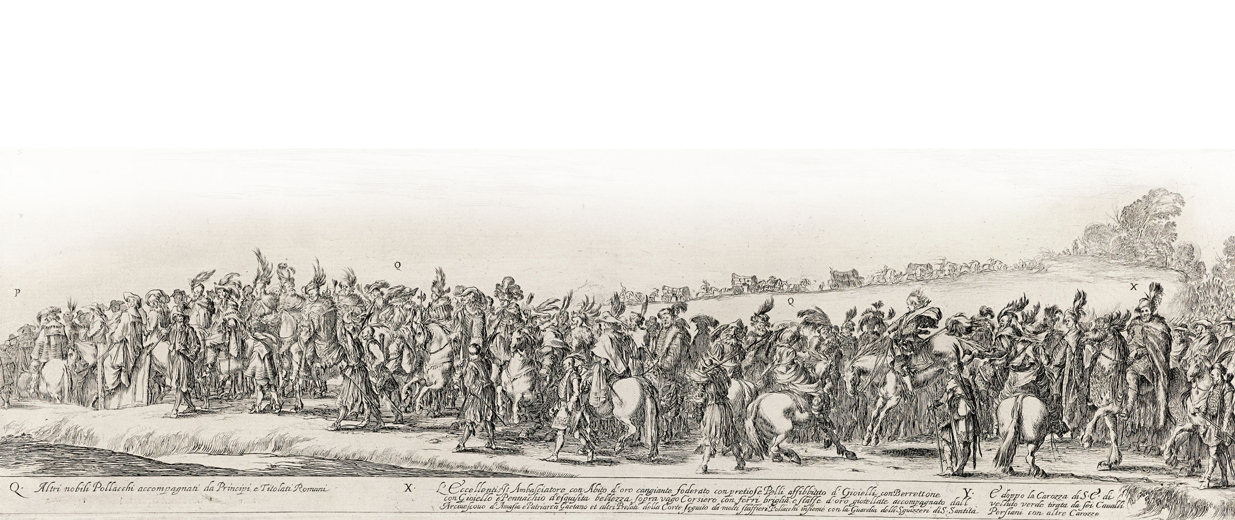 Egzotyczne widowisko. Na czele barwnego i licznego korowodu jechało dwóch szlachciców w polskich strojach z czerwonej satyny, a za nimi podążały 22 wozy zaprzężone w muły i okryte kolorowymi suknami z herbami uczestników orszaku. Dalej Tatarzy i Ormianie prowadzili 10 wielbłądów w srebrnych uprzężach, a za nimi szli czterej trębacze. Następnie kroczyło 30 uzbrojonych kozaków w czerwonych jedwabnych płaszczach, oddział gwardii papieskiej z trębaczami i starszy pokojowy posła, Kociszewski, który wymachiwał buńczukiem.