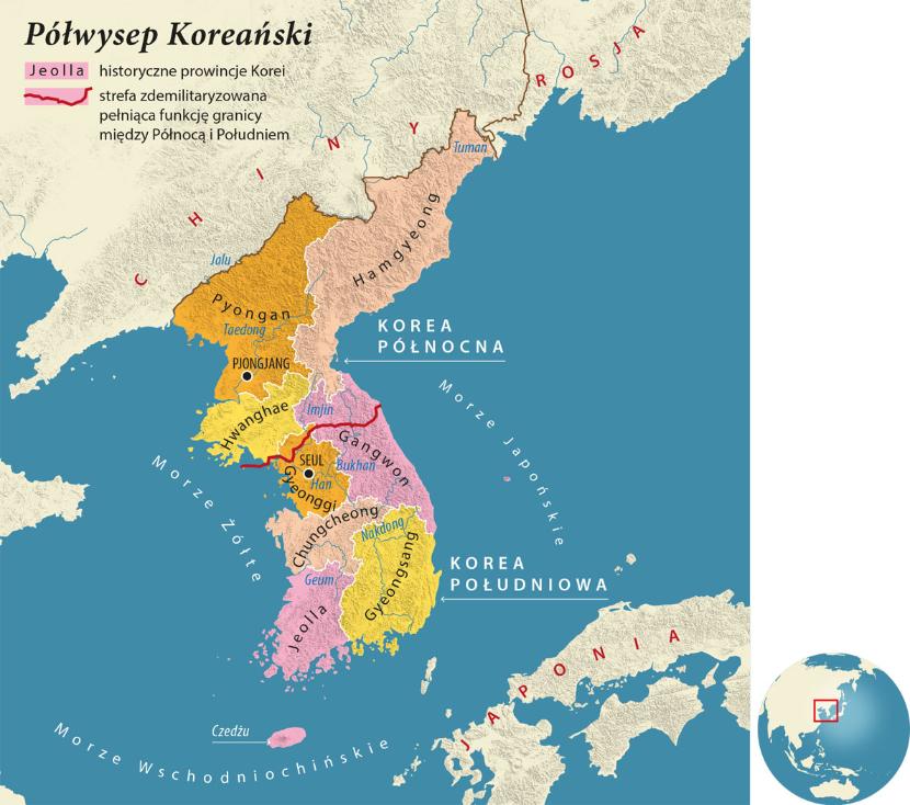 Państwa, prowincje, miasta. Słowo Korea to przekształcona przez bliskowschodnich kupców nazwa średniowiecznego królestwa znanego jako Goryeo (Koryŏ). Oba współczesne państwa koreańskie formą Korea posługują się w kontaktach ze światem zewnętrznym. Na własny użytek Północ (Koreańska Republika Ludowo-Demokratyczna) określa się jako Joseon, Południe (Republika Korei) – Hanguk. Populacja Południa sięga 52 mln osób, połowa z nich mieszka w aglomeracji stołecznego Seulu, a także m.in. w Daegu i portowo-stoczniowym Busanie (Pusanie). Niewielka powierzchnia kraju (100 tys. km kw.) sprawia, że gęstość zaludnienia jest bardzo wysoka, przekracza pół tysiąca osób na 1 km kw. Terytorium Północy jest o jedną piątą większe (120 tys. km kw.), ludności jest o połowę mniej (ok. 26 mln), która skupia się przede wszystkim w miejscowościach zachodniego wybrzeża, w tym w około trzymilionowym Pjongjangu (Phenianie), stolicy komunistycznego państwa.