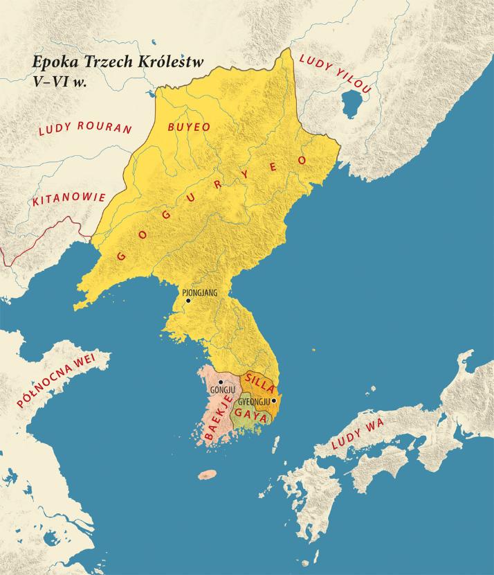 Gojoseon (do 108 r. p.n.e.). Historiografia koreańska tradycyjnie wiąże początki państwowości na Półwyspie Koreańskim z istnieniem Joseonu (lub Gojoseonu, Starego Joseonu, dla odróżnienia od późniejszego państwa Joseon, założonego w XIV w.), w chińskich źródłach określanego jako Chaoxian. Jeśli odłożyć na bok mity (np. o założeniu starożytnego Gojoseonu przez Danguna w 2333 r. p.n.e.), to obecnie jedyną pewną datą jest tu 109 r. p.n.e. odnotowany w kronikach chińskich. Cesarz Wudi z chińskiej dynastii Han podbił wówczas to koreańskie państwo, okupując stolicę Wanggeom i pozbawiając życia ostatniego króla Ugeo (129–108 p.n.e.), będącego zresztą wnukiem Wimana, buntownika i uciekiniera z Chin, który uzurpował władzę w Gojoseonie ponad pół wieku wcześniej. Z tego względu ostatni etap istnienia Gojoseonu określa się też jako Wiman Joseon.