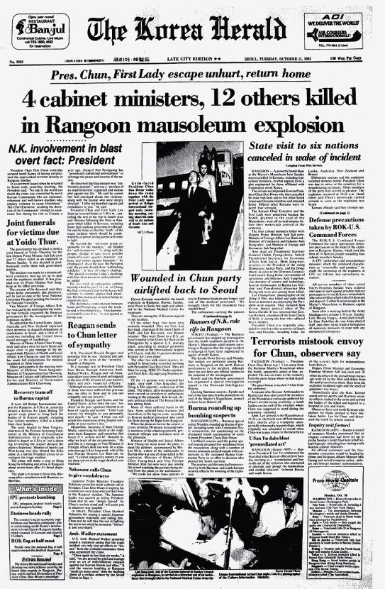 Państwowy terroryzm. Typowym aktem terroryzmu państwowego były wydarzenia w Rangunie. 9 października 1983 r. północnokoreańskie komando złożone z trzech oficerów służb specjalnych usiłowało zgładzić prezydenta Republiki Korei Chun Doo-hwana składającego wizytę w Birmie. W Mauzoleum Aung Sana podłożono trzy ładunki wybuchowe. W następstwie eksplozji zginęło 17 Koreańczyków (w tym czterech wysokich urzędników). Ponadto śmierć poniosło czterech Birmańczyków. Z kolei 29 listopada 1987 r. para północnokoreańskich agentów umieściła ładunek wybuchowy w kabinie pasażerskiej południowokoreańskiego rejsowego Boeinga 707 lecącego z Bagdadu, via Bangkok, do Seulu. Do eksplozji doszło nad Morzem Andamańskim. Zginęła cała załoga i wszyscy pasażerowie, łącznie 115 osób. W atakach terrorystycznych trudno dopatrzeć się innej długoterminowej strategii niż dążenie do wzmocnienia pozycji przetargowej poprzez manifestowanie nieprzewidywalności.
