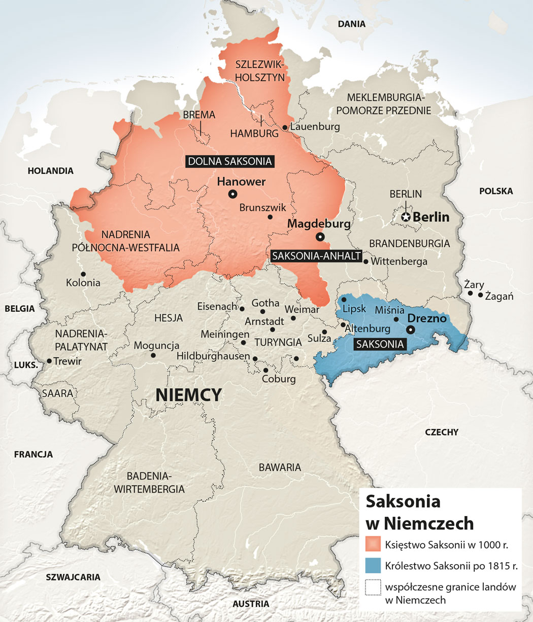 Germańskie plemiona saskie. Wettynowie byli najdłużej panującą dynastią w Europie, rządzącą Saksonią przez 830 lat. Ta rodowa historia rzutowała na zmiany sposobu, w jaki określano kraj, i na wędrówkę nazwy Saksonia na mapie środkowej Europy: z północnego zachodu na południowy wschód. Określenie tą nazwą tworu państwowego i dynastycznego z centrum w Dreźnie (nawiązującego do średniowiecznej Marchii Miśnieńskiej) ustaliło się dopiero na przełomie średniowiecza i czasów nowożytnych.