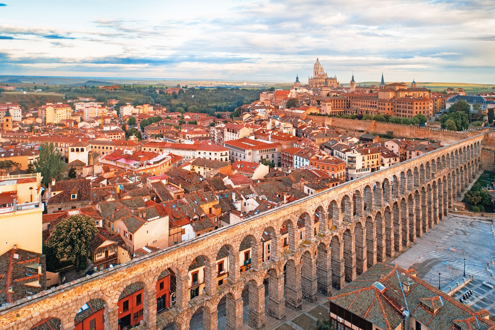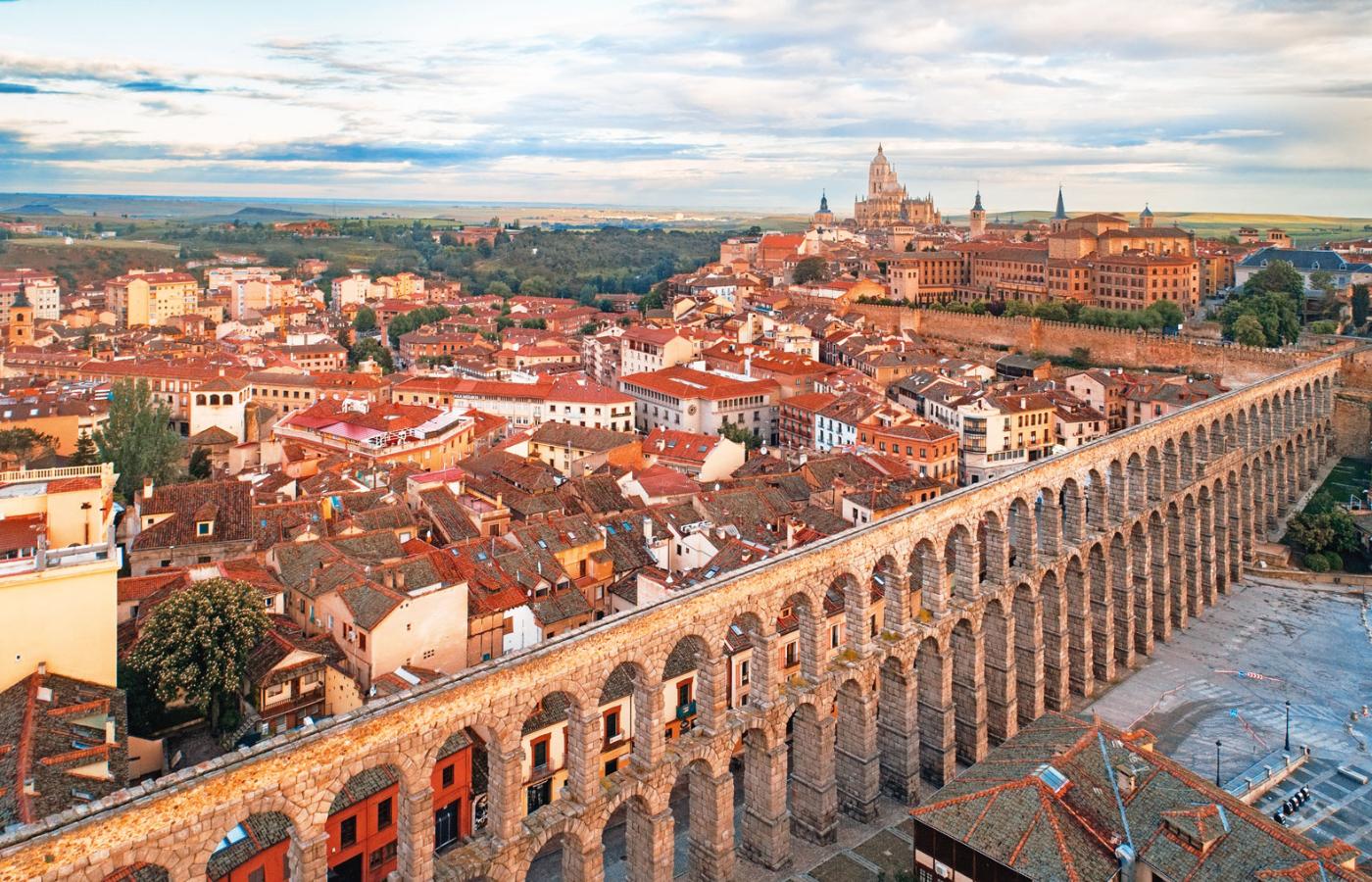 Akwedukt w Segowii. Jedno z najlepiej zachowanych dzieł inżynierii rzymskiej na świecie. Akwedukt został zbudowany w I w. n.e., za panowania Domicjana lub Trajana, a jego głównym zadaniem było doprowadzanie wody z gór Sierra de Guadarrama do miasta Segowia. Funkcję tę spełniał do 1973 r. Wykonany z ponad 20 tys. wielkich bloków lokalnego granitu bez użycia zaprawy, rozciąga się na ponad 16 km. W najbardziej charakterystycznym odcinku miejskim można podziwiać 167 arkad nałożonych na siebie na długości 800 m, o maksymalnej wysokości 28 m. Pochodzący z Flandrii podróżnik Antoine Lalaing w 1502 r. odwiedził po raz pierwszy Półwysep Iberyjski i w swojej kronice opisał jego miasta. Swoją relację z Segowii rozpoczął od zachwytu nad rozmiarami akweduktu, pisząc, że tak olbrzymi obiekt mógł zbudować tylko diabeł lub Herkules.