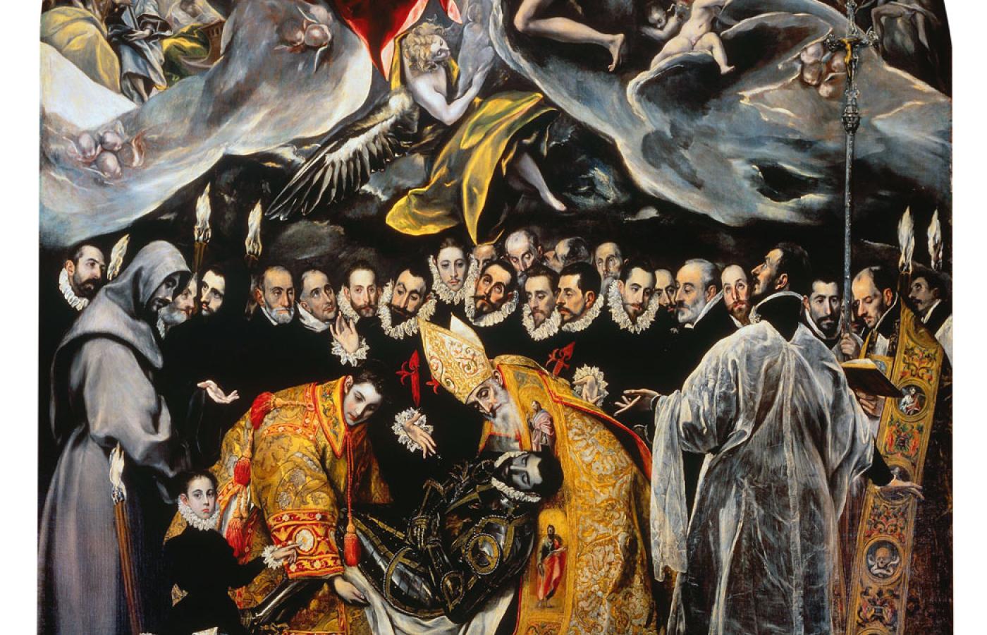 W Toledo nie powiodły się co prawda starania Kreteńczyka, by nawiązać trwałą współpracę z królewskim dworem, był jednak artystą cenionym. W byłej stolicy Hiszpanii jego styl okrzepł, postacie na płótnach są strzeliste niczym płomienie świec. El Greco stworzył liczne portrety, pejzaże oraz sceny z życia świętych. Szczególne miejsce w jego twórczości zajmuje „Pogrzeb hrabiego Orgaza”. W tym ogromnym płótnie artysta nie zapomniał lekcji malowania ikon, kompozycyjnie dzieląc obraz na świat ziemski i niebiański. Dolna część przedstawia sceny pogrzebu, w górnej anioł prowadzi duszę hrabiego do Chrystusa Pantokratora. Obraz jest grupowym portretem, który nie występował dotychczas w hiszpańskiej sztuce.