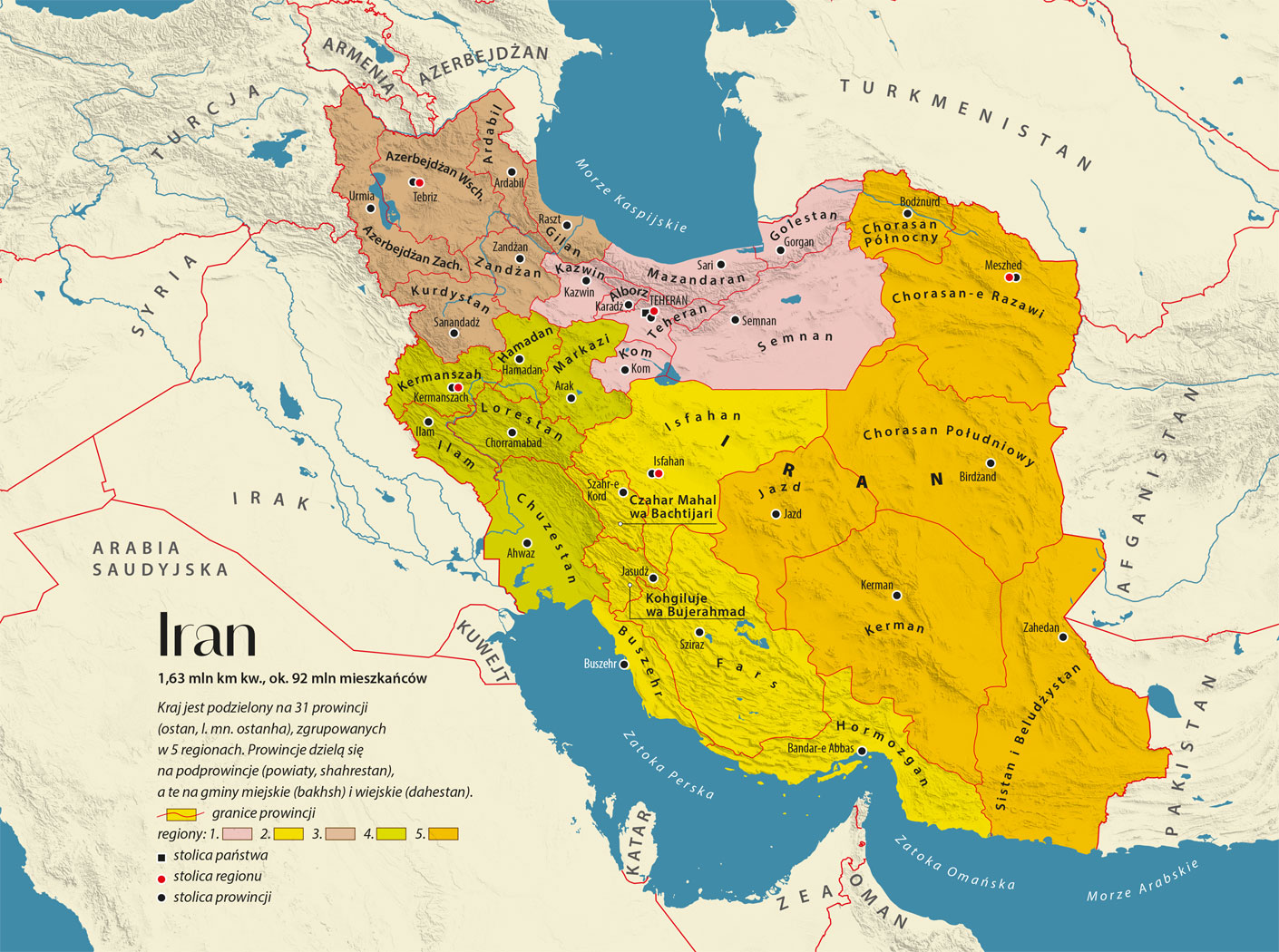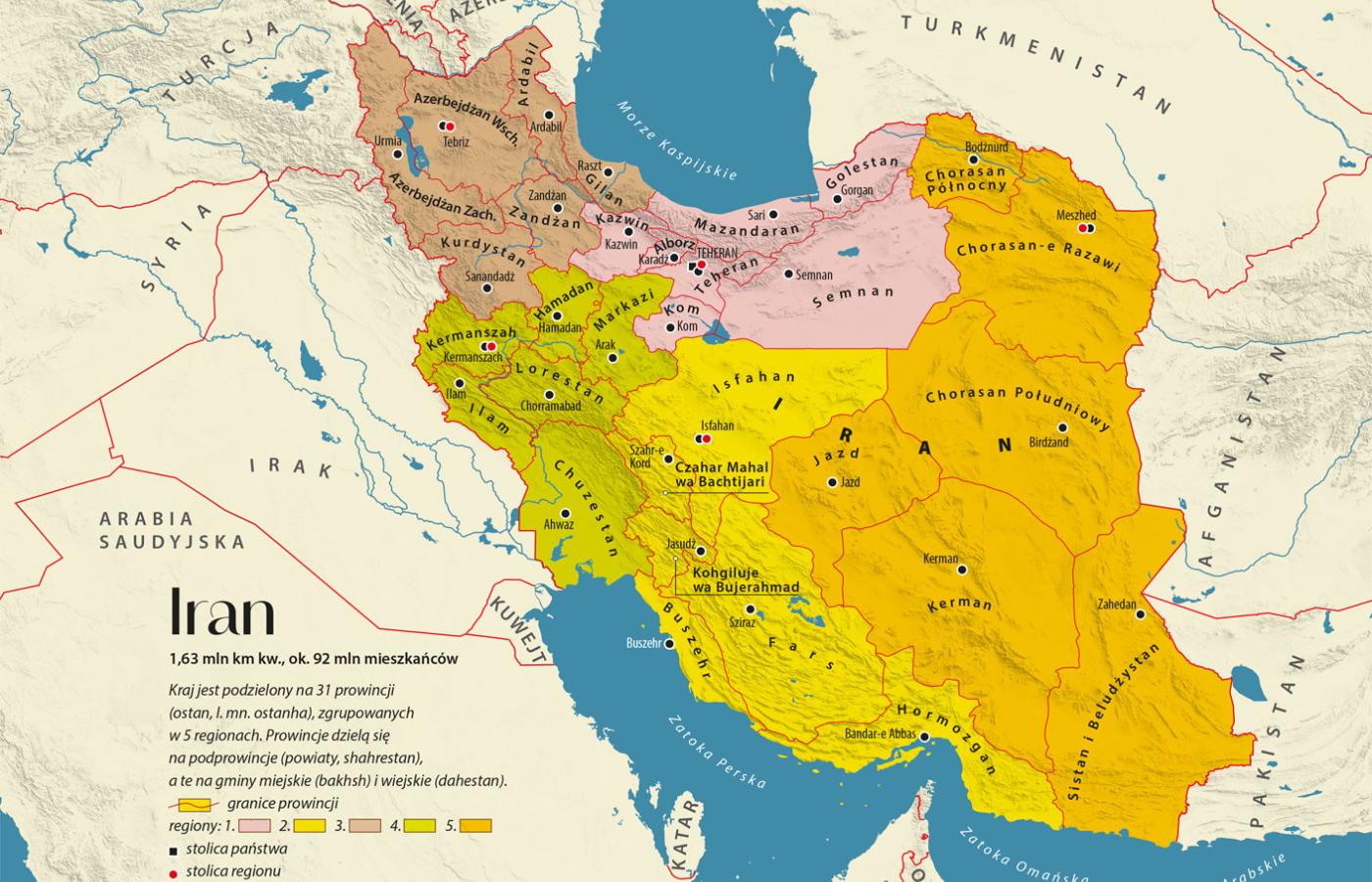 Geograficzna mozaika i cywilizacyjny pomost. Iran leży na styku Bliskiego oraz Środkowego Wschodu. Jego rozległe terytorium – ok. 1,63 mln km kw. – obejmuje niemal wszystkie typy krajobrazu. Przez wieki krzyżowały się tu drogi handlowe i kulturowe – od starożytnego Jedwabnego Szlaku po współczesne korytarze transportowe surowców czy idei. Choć dzisiejszy Iran zamykają jasno wytyczone granice, w historii ich przebieg był zmienny – kolejne dynastie władały różnymi ziemiami leżącymi między Kaukazem i Mezopotamią a Azją Środkową i północnymi Indiami. Tym, co tworzyło trwałą oś irańskiej tożsamości, był jednak ów geograficzno-kulturowy rdzeń – Wyżyna Irańska – stanowiąca kolebkę tutejszej cywilizacji, języka i tradycji, które przetrwały nawet największe dziejowe zawirowania.