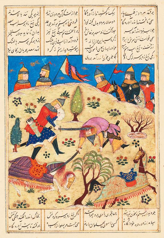 Taktyka Arabów. Początek islamizacji Iranu. Sasanidzi kontrolowali Arabię za pośrednictwem swoich wasali, Lachmidów, ale szach Chosrow II ich wyeliminował, co miało katastrofalne skutki. Arabowie usamodzielnili się od Persji, a w tym samym czasie działalność rozpoczął Mahomet, założyciel nowej religii, islamu, oraz jednoczyciel Arabów. Gdy umierał w 632 r., cały Półwysep Arabski był gotów do ekspansji przeciw imperiom Rzymu i Persji. Nowi przywódcy zostali nazwani kalifami. (Pierwsi czterej byli obieralni: Abu Bakr 632–634, Umar/Omar 634–644, Usman/Osman 644–656, Ali 656–661). Rozpoczęli oni ataki na region Ktezyfontu, ale początkowo zostali odparci w tzw. bitwie mostu. Gdy jednak na czele arabskiej armii stanął Sad ibn Abi Waqqas, podboje przyspieszyły. W wielkiej kilkudniowej bitwie pod Kadisijją (ok. 638 r.) Arabowie odnieśli zwycięstwo, a perski wódz Rustam poległ. W ręce najeźdźców dostał się Ktezyfont, a szach Jazdegerd uciekł na północ. Cała Mezopotamia odpadła od Sasanidów, których granicą stały się teraz góry Zagros.