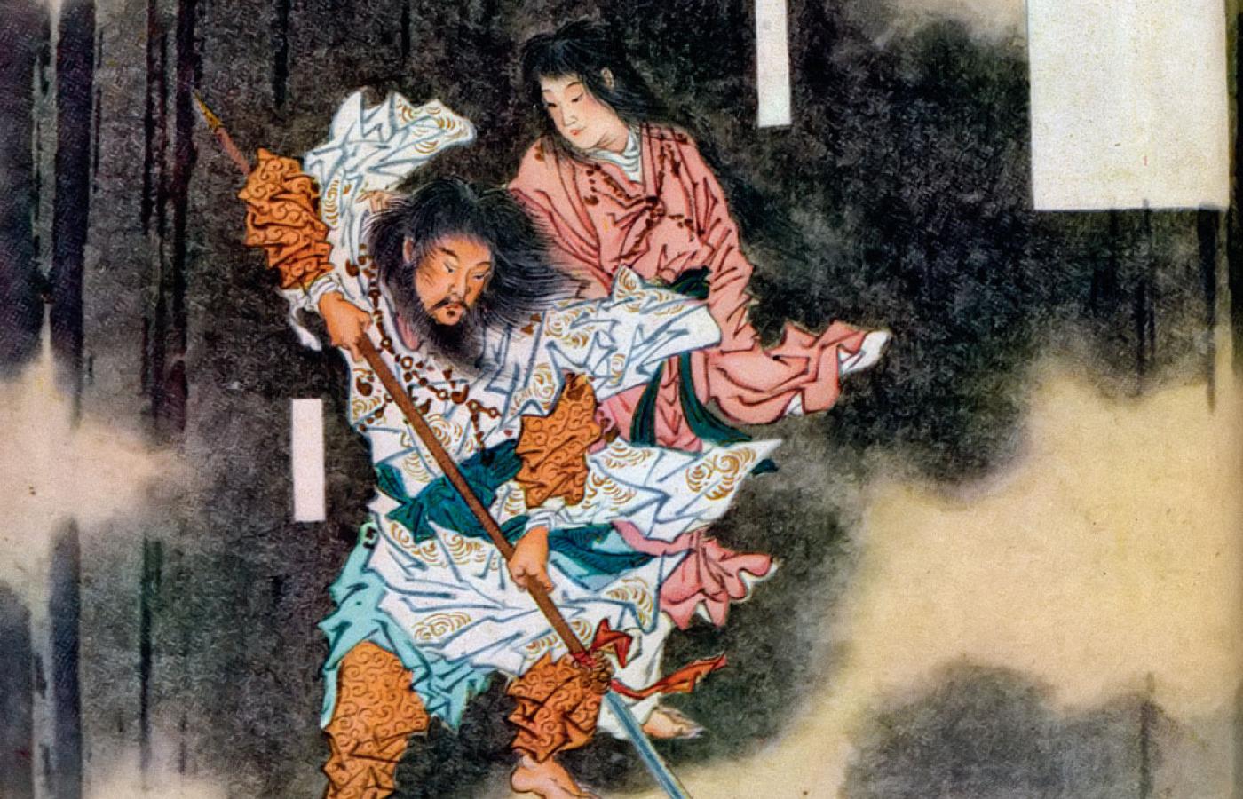Akt tworzenia Izanami i Izanagi. Jak doszło do tego, że bogini słońca Amaterasu zesłała swojego wnuka Ninigiego, aby jego ród rządził na archipelagu japońskim? Musimy zacząć od mitu kosmologicznego zawartego w kronice dworskiej „Księga dawnych wydarzeń” („Kojiki”; 712 r.). Zrazu pramateria była w stanie chaosu, a potem wyłoniła się Wysoka Równina Niebios, choć ciężka materia jeszcze nie okrzepła i „na podobieństwo tłuszczu chybotała się niczym meduza”. Na Wysokiej Równinie Niebios pojawiły się pierwsze trzy bóstwa, „duchy jednostkowe o niewidzialnych postaciach”: Amenominakanushi (Pan Ogarniający Wszystko na Niebie), Kamimusubi (Najwyższa Święta Moc Życiodajna) i Takamimusubi (Boska Moc Życiodajna), następnie kolejne, jednak dopiero para demiurgów, Izanami (Wielki Duch Wzburzający Szlachetne Łono) i Izanagi (Wielki Duch Uśmierzający Szlachetne Łono), przystąpiła do aktu tworzenia.