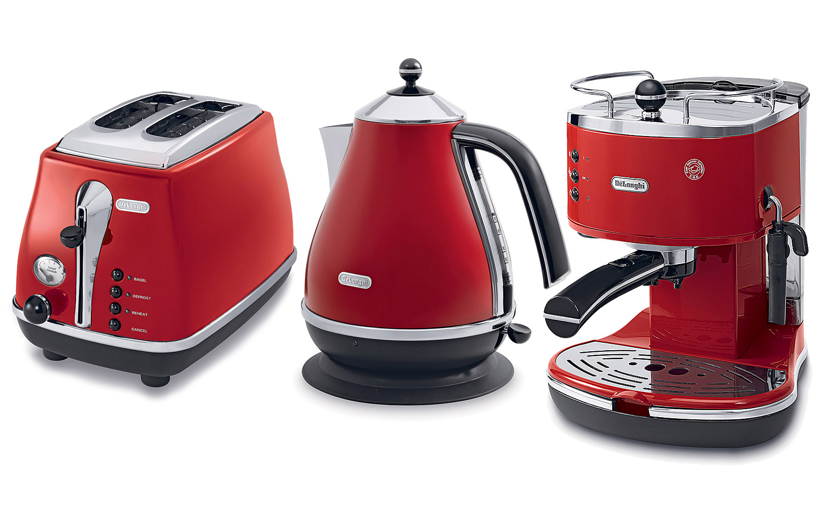 Czajnik, ekspres ciśnieniowy i toster DeLonghi, seria Icona. Te trzy urządzenia to ikony włoskiego stylu z lat 50./60. Do wyboru w kolorach: czarnym, czerwonym, białym lub turkusowym. Cena: ekspres – od 550 zł, toster – od 199 zł, czajnik – od 275 zł. Czajnik, ekspres ciśnieniowy i toster DeLonghi, seria Icona. Te trzy urządzenia to ikony włoskiego stylu z lat 50./60. Do wyboru w kolorach: czarnym, czerwonym, białym lub turkusowym. Cena: ekspres – od 550 zł, toster – od 199 zł, czajnik – od 275 zł. materiały prasowe