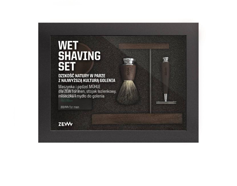 Ekskluzywny zestaw do golenia na mokro Wet Shaving Set marki ZEW for men zawiera: mydło do golenia z węglem drzewnym, pędzel z naturalnego, delikatnego włosia borsuka, maszynkę z wymiennymi wkładami i drewnianą miseczkę. Dla pewnych siebie, wyrafinowanych mężczyzn, którzy docenią wysoką jakość i trwałość wykonania.
