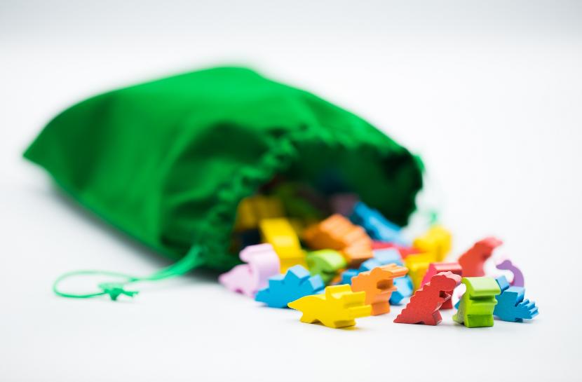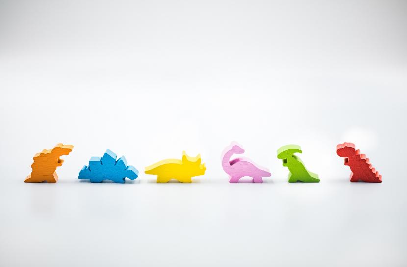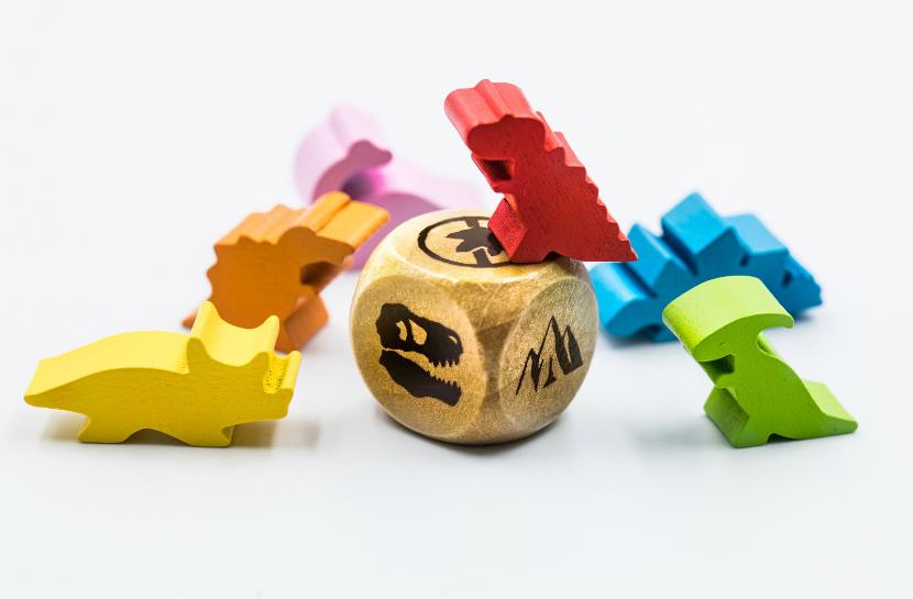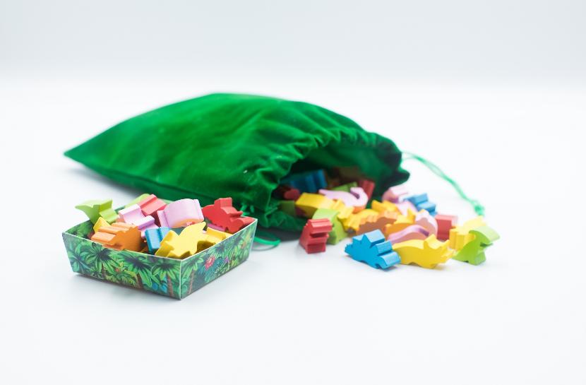 W pudełku znajdziesz wyjątkowe elementy gry: 60 drewnianych pionków dinozaurów, specjalną kostkę, 5 dwustronnych plansz, miseczki na pionki oraz woreczek do losowania dinozaurów.
