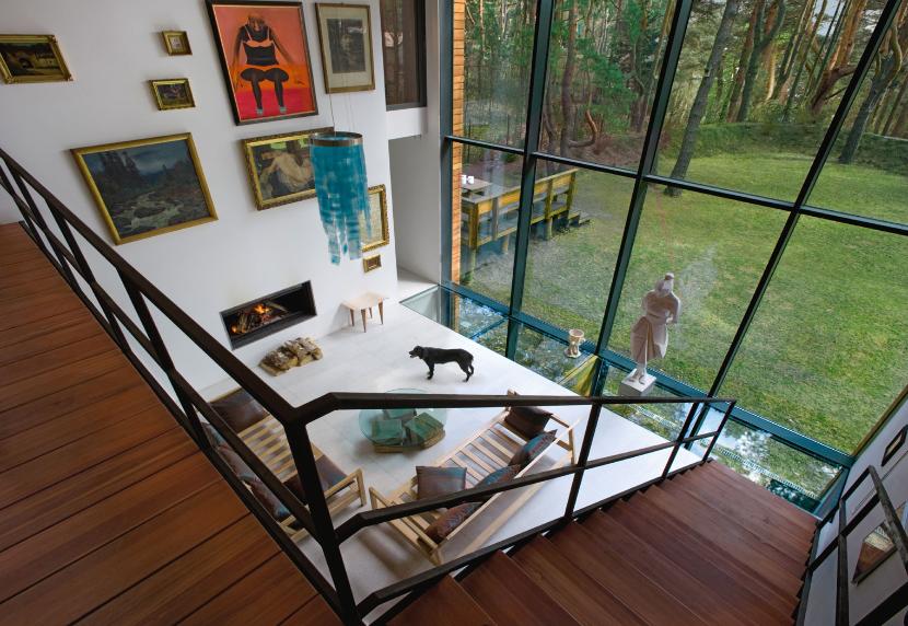 W domach ulokowanych w lesie, zwłaszcza tych o tradycyjnej formie, często jest problem z dostępem do światła dziennego. Tutaj ogromne przeszklenia umożliwiają swobodną wędrówkę promieni słonecznych po wnętrzach. Z salonu patrzymy na leśny ogród przez największe „okno” o rozmiarach 6 na 7,5 m. Stojąca na jego tle rzeźba „Dziewczyna” Wioletty Kowalczyk zdaje się być wręcz onieśmielona tą ekspozycją.
