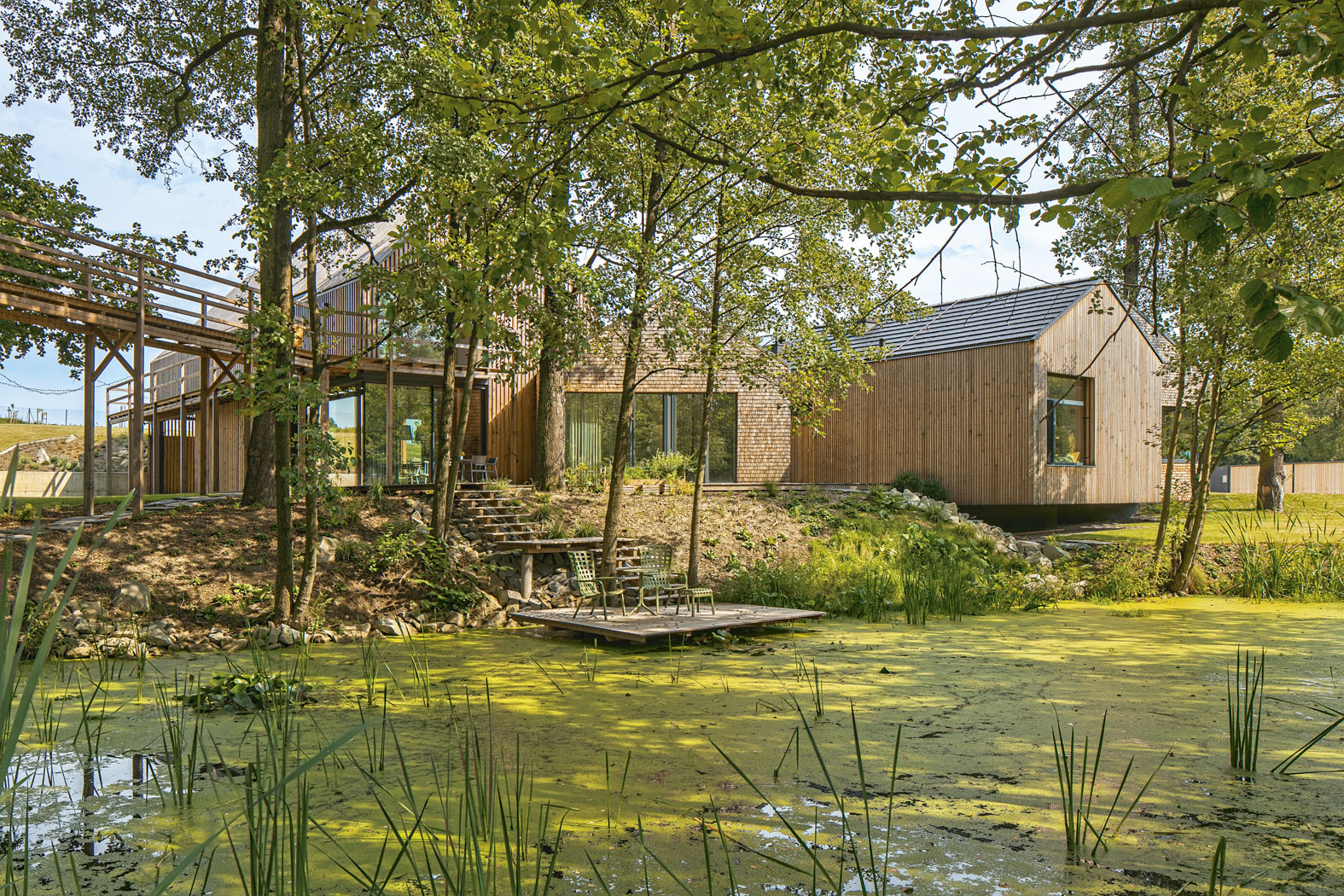 Bryła obudowana była ażurem z desek. Taką samą ażurową osłonę miał taras, na który wychodziło się prosto z sypialni. Na piętrze zaplanował też duże balkonowe okno prowadzące na 20-metrową kładkę. Biegła w stronę drzew rosnących po drugiej stronie rzeczki. – Wyobrażałem sobie, jak wstaję rano i na bosaka idę nią na spacer nad strumieniem. Nie muszę się przebierać, obawiać się spotkania z dzikiem. I w środku nocy, i o wschodzie słońca mogę sobie bezpiecznie pochodzić wśród drzew – opowiada architekt.