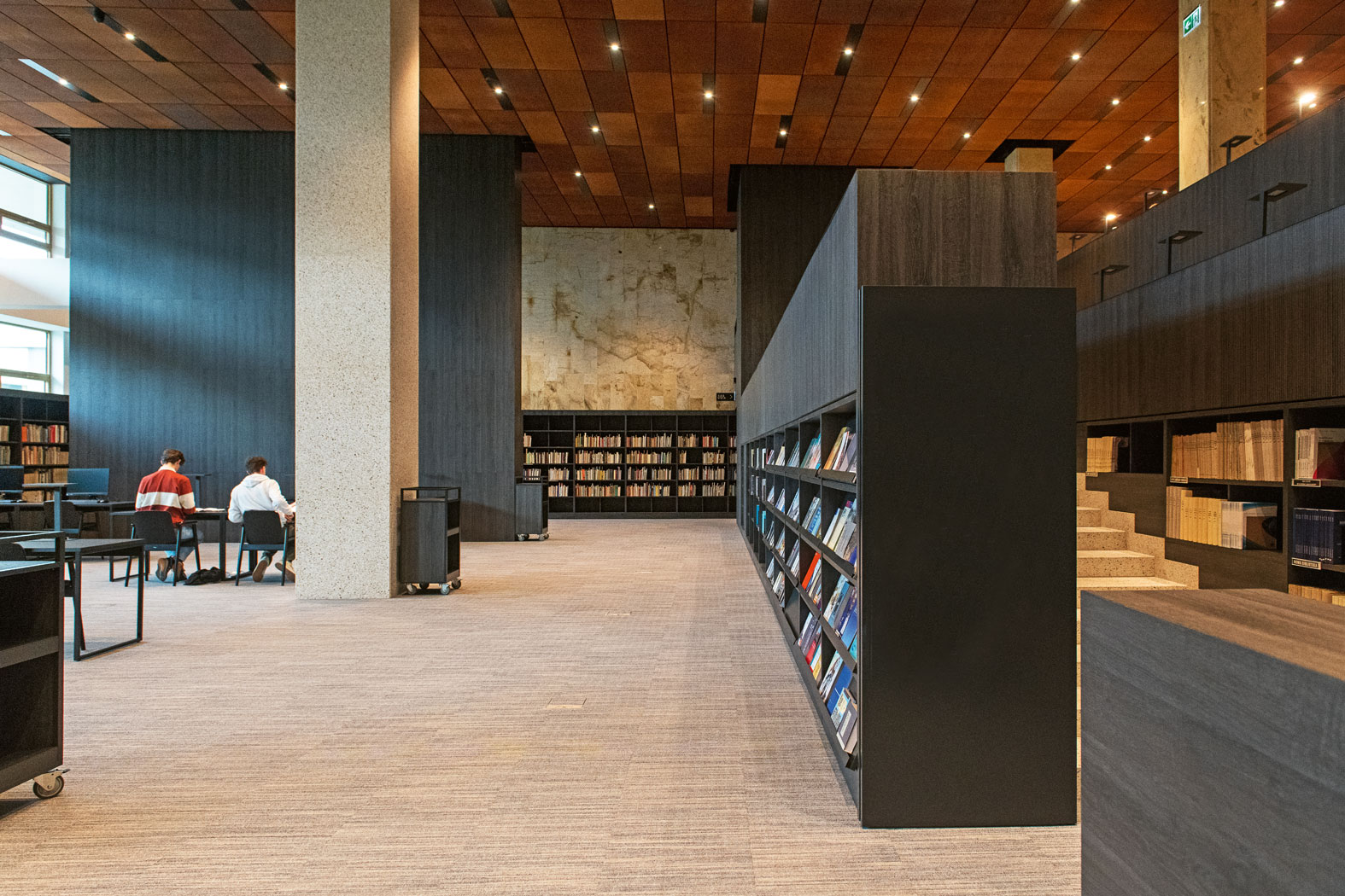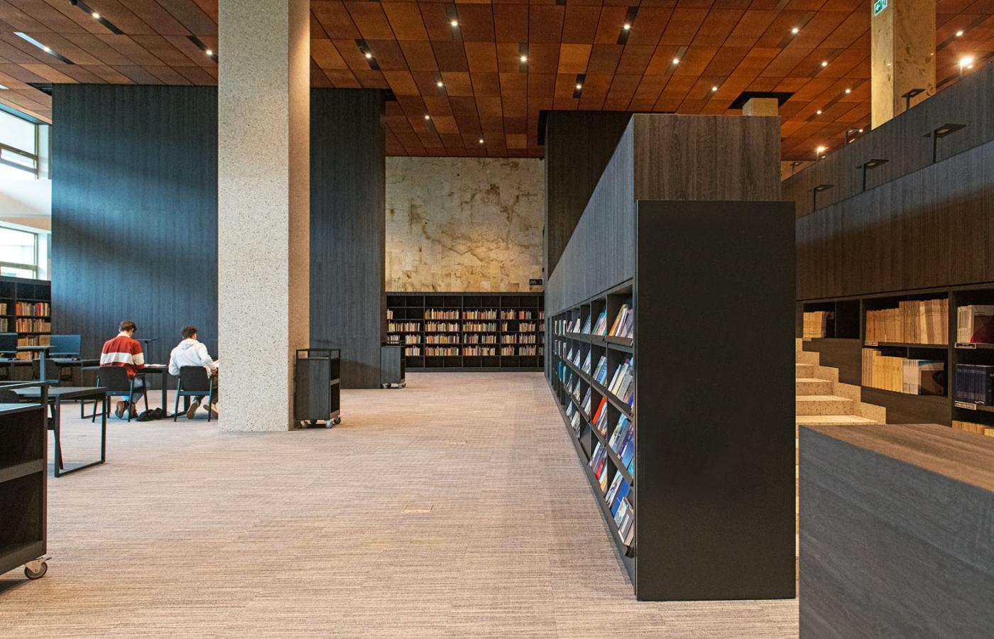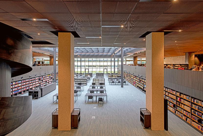 Układ przestrzeni komunikacyjnych i czytelni jest teraz zdecydowanie bardziej... czytelny, bo wymyślony według jasno określonej hierarchii. Główna czytelnia została umieszczona na przecięciu osi wejścia głównego i czytelni pomniejszych, do tego zaopatrzono ją w ikoniczny akcent w postaci spiralnych schodów. Nie zapomniano o rampie dla niepełnosprawnych i dostępie odbitego światła naturalnego, które dostaje się do stonowanej, matowej przestrzeni przez okna łączące ją z patiami. Zwiedzając parter przed remontem, mogło się wydawać, że Fijałkowski postrzegał bibliotekę jako monumentalną, ciemnawą, trudną do zgłębienia neolityczną świątynię. Tomasz Konior z zespołem wprowadzili tu swobodę ruchu wynikającą z intuicyjnego rozpoznawania przestrzeni, a do tego komfort i wrażenie dyskretnego luksusu.