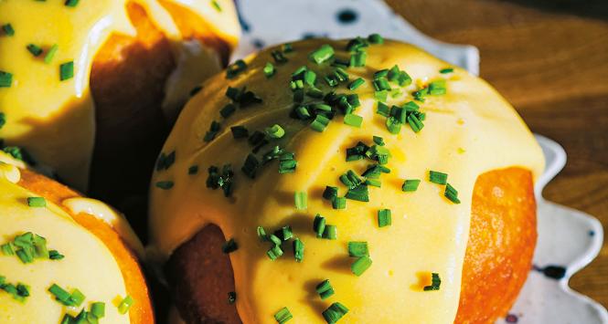 Nasze drożdżowe wypieki podajemy z ciepłym sosem serowym, posypane szczypiorkiem.