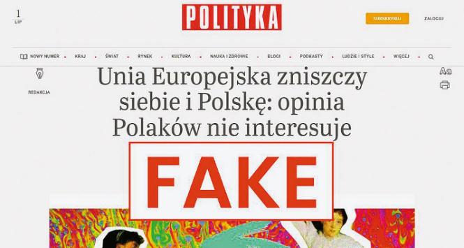Strona główna portalu polityka.pl, a na niej wielki tytuł „Unia Europejska zniszczy siebie i Polskę: opinia Polaków nie interesuje”. Błędy językowe odwracają uwagę od drobnego szczegółu. To nie jest strona „Polityki”, a rosyjska akcja Doppelgänger.