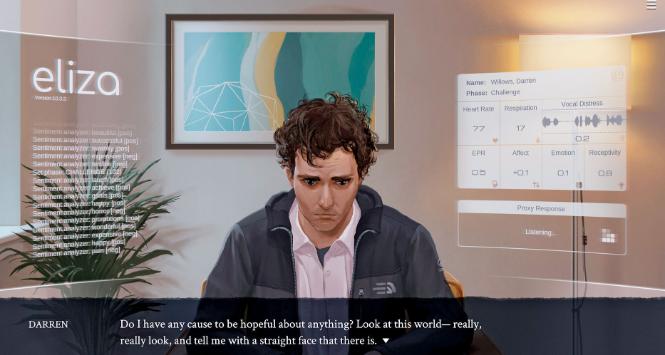 „Eliza” to interaktywna powieść wizualna napisana przez Matta Burnsa, wypalonego najemnika korporacji programistycznych.