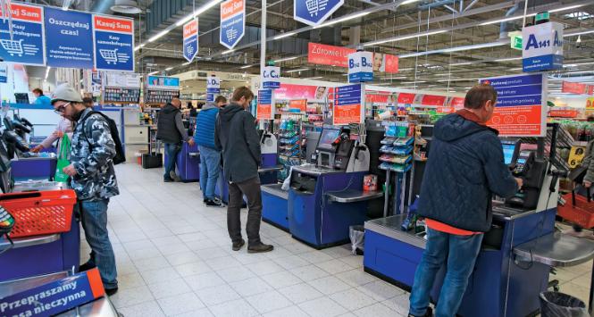 Sklepy spożywcze to już ostatnie miejsca publiczne, w których wolno się jeszcze gromadzić. Ale bez przesady: trzeba zachować półtorametrowy dystans albo stać na zewnątrz. Sami klienci pilnują odległości. Patrzą też sobie na ręce. I do koszyków.