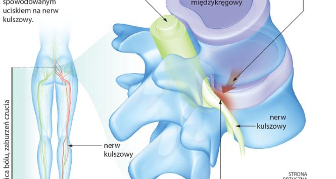 Opisywana jest jako ostry, rwący, kłujący lub piekący ból dolnej części kręgosłupa, promieniujący do pośladków, uda, a nawet do stopy.