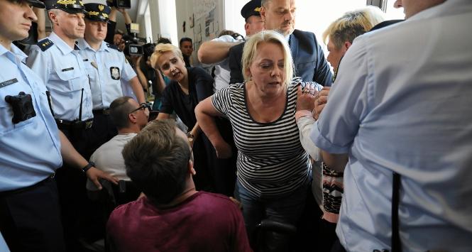 Protestujący próbowali wywiesić w Sejmie transparent. Użyto siły