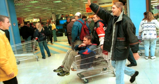 W Polsce rosną sklepy wielkie (zwane supermarketami) i olbrzymie (zwane hipermarketami), niektóre o powierzchni boiska piłkarskiego. Wywołują panikę wśród drobnych handlarzy. Giganci ustawiają się, jak to się kiedyś mówiło, frontem do klientów i skutecznie odbierają ich drobnym sklepikarzom. Ale miłe dla kupujących olbrzymy są twarde wobec dostawców i swych pracowników.