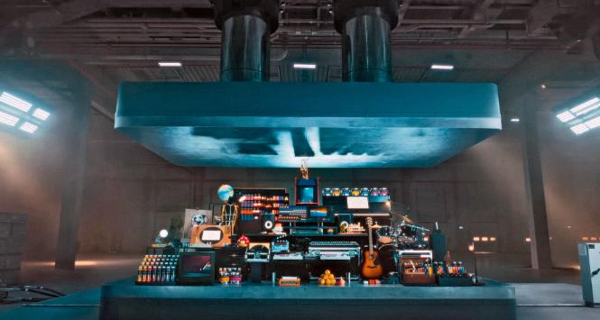 Filmik przedstawia olbrzymią prasę hydrauliczną, która miażdży analogowe instrumenty i narzędzia, żeby sprasować je do rozmiaru iPada.