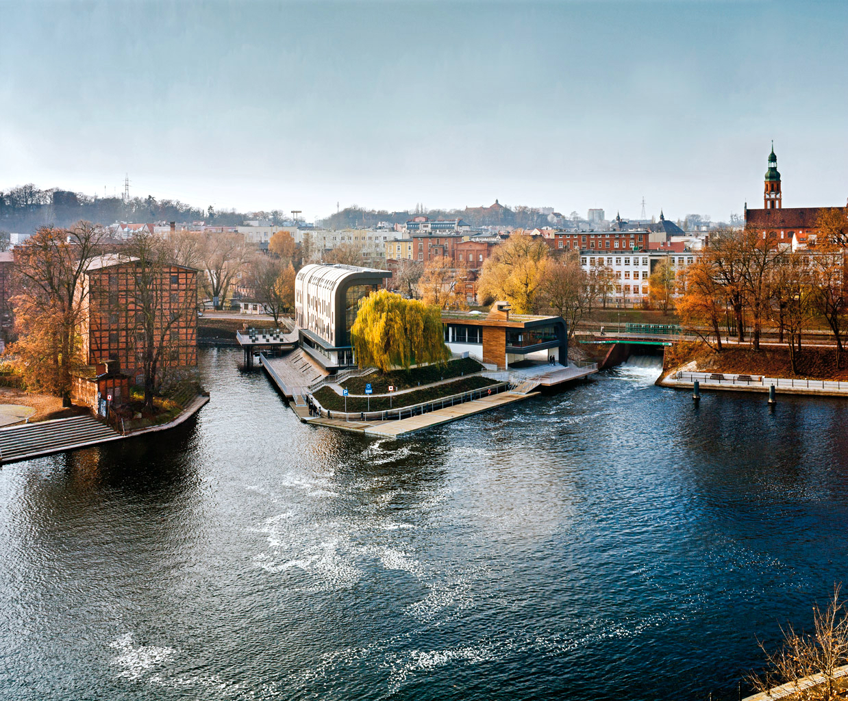 Marina – co warto zaznaczyć – jest elementem szerszego i konsekwentnie realizowanego programu rewitalizacji bydgoskiej Wyspy Młyńskiej – uroczej, acz przez dziesięciolecia mocno zaniedbanej zielonej enklawy w centrum miasta. Pobudowano nowe kładki łączące wyspę z resztą miasta, wytyczono deptaki i ścieżki rowerowe, a zaniedbanym budynkom przydano nowe funkcje (np. muzealne). I trzeba przyznać, że mieszkańcy Bydgoszczy bardzo szybko poczuli identyfikację z tą staro-nową przestrzenią publiczną. Docenili ją także eksperci – rewitalizacja Wyspy nagrodzona została przez Światową Organizację ds. Wypoczynku.