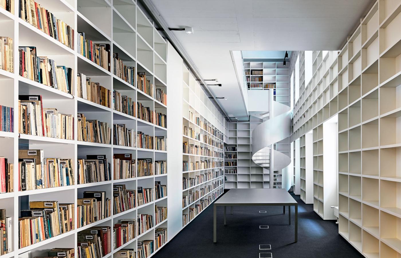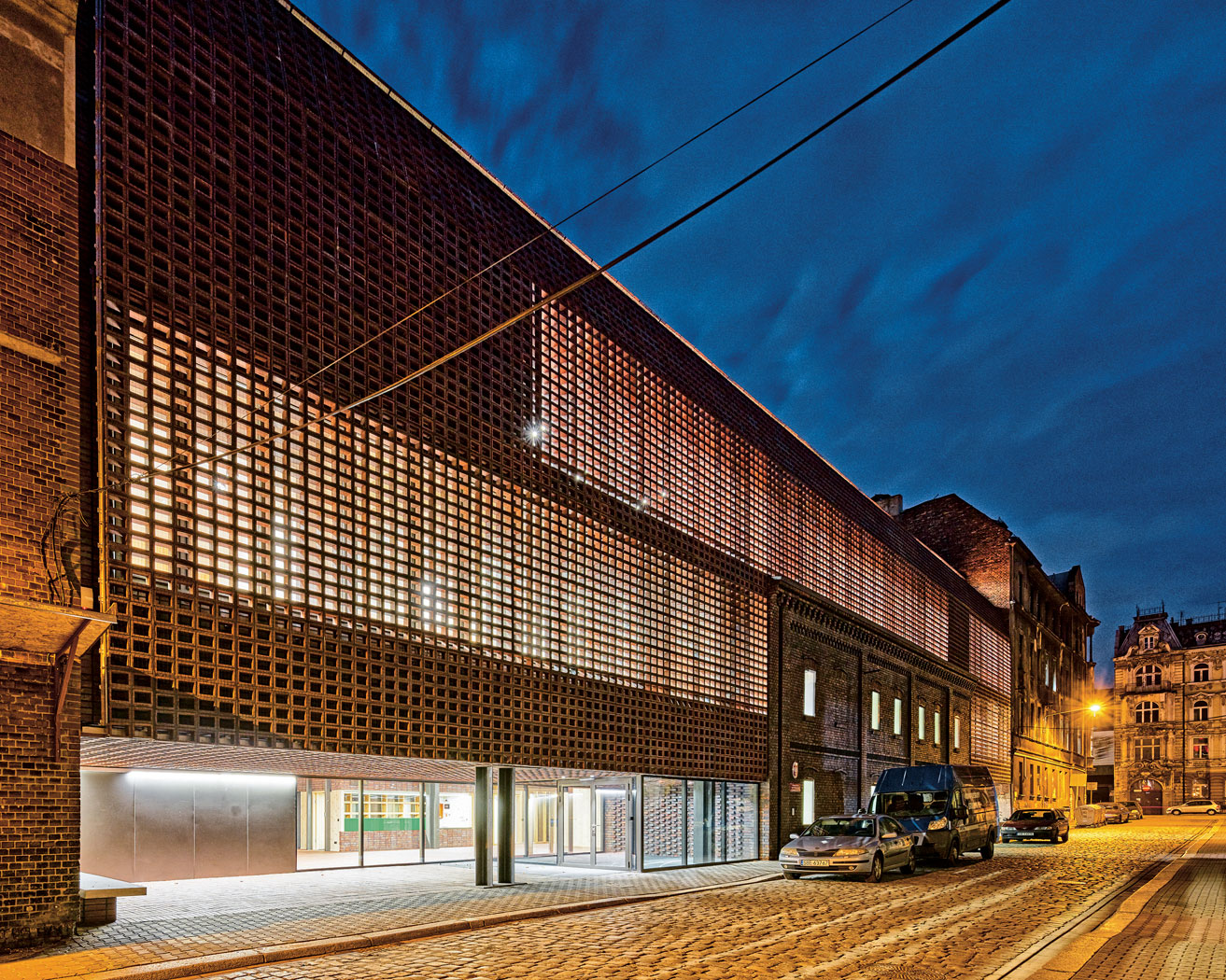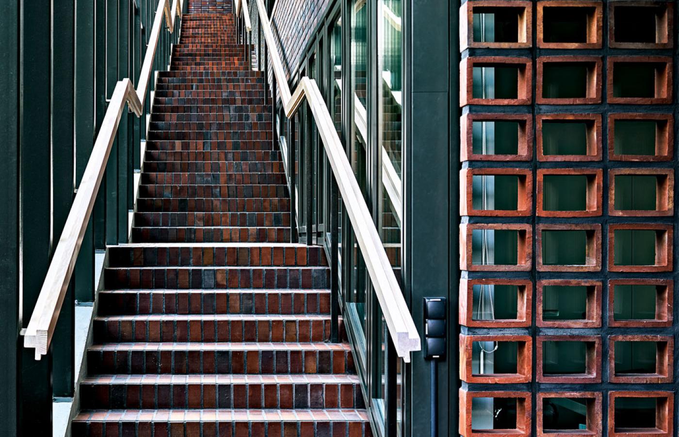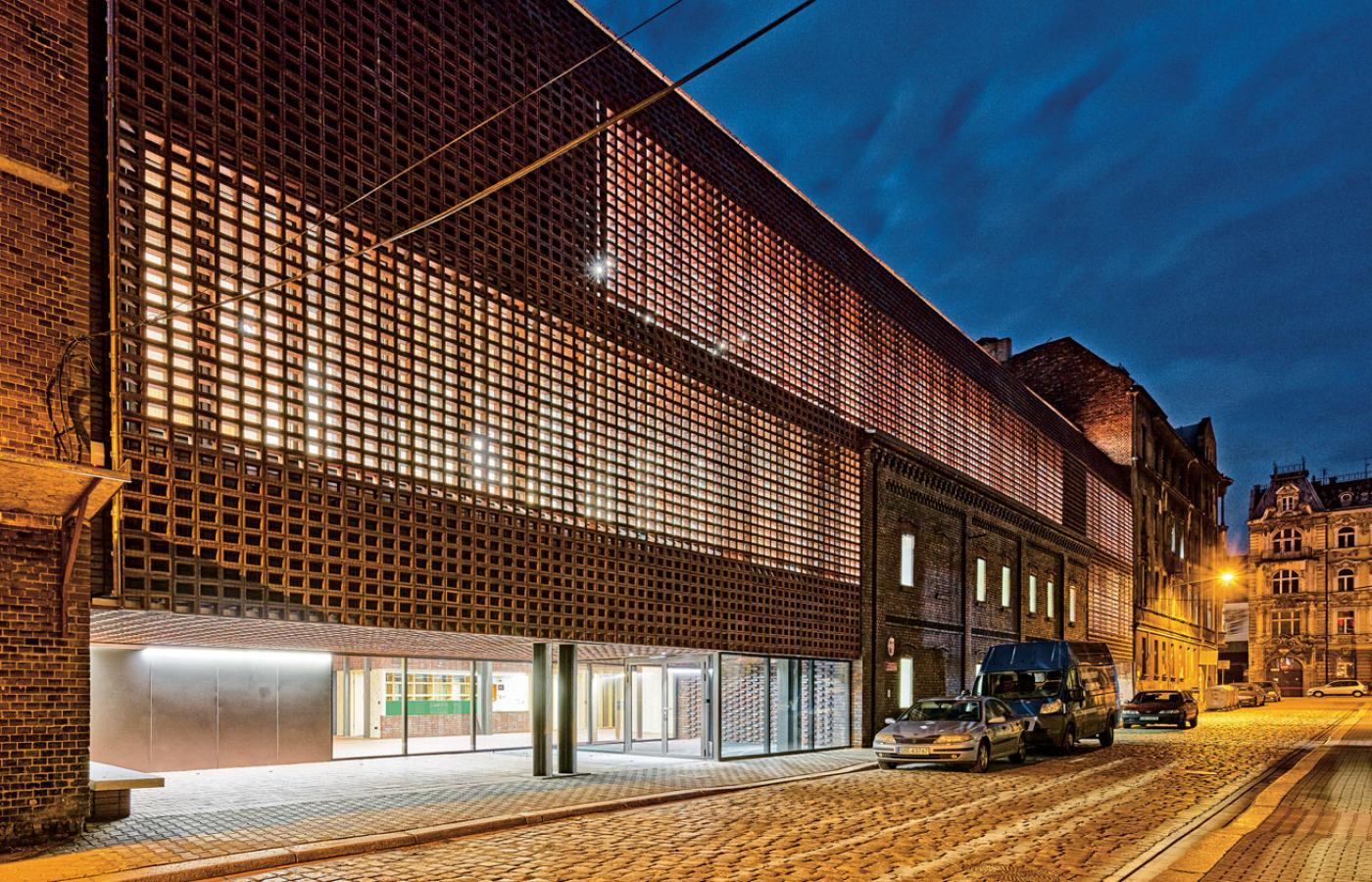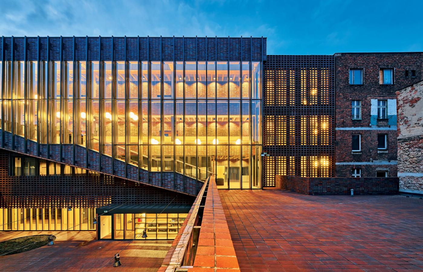 Nieuważny przechodzień może nawet przegapić nową realizację. Trzyma ona wysokość i podziały sąsiadujących z nią kamienic, upodabnia się do nich kolorem klinkierowej elewacji, stworzonej z ceramicznych pustaków. Wypalano je w jednym z ostatnich węglowych pieców w Europie, co sprawiło, że przebarwienia i naloty stwarzają wrażenie starych i trwających tu od dziesiątek lat. I tylko nowoczesna faktura (pustaki pokryte są i niejako powiązane ze sobą stalową siatką) sygnalizuje, że to nie historyczny obiekt. Fantastycznym zabiegiem okazało się zachowanie starego i w momencie projektowania mocno zniszczonego budynku dawnej fabryczki żarówek, mimo że warunki konkursu dopuszczały jego wyburzenie (i większość konkursowych projektów owo wyburzenie uwzględniało). Teraz nie tylko tkwi jak relikt przeszłości, symbol historii, wmontowany w sam środek fasady, ale jest świadectwem perfekcyjnego zespolenia starego z nowym. A przy okazji ta przestrzeń znów ożyła; umieszczono w niej wydziałową bibliotekę.
