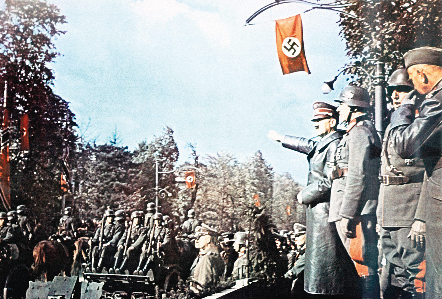 Tutaj, przy dźwiękach wojskowej orkiestry, Hitler w otoczeniu generałów patrzył dumnie na maszerujących w szeregach żołnierzy piechoty, kawalerii i artylerii. Po blisko dwóch godzinach, gdy defilada zbliżała się do końca, Hitler wsiadł do swego Mercedesa i całą kawalkadą pojazdów ruszył w kierunku placu Piłsudskiego. Pokonując Aleje Ujazdowskie i Nowy Świat, stał na miejscu pasażera z podniesioną w nazistowskim geście ręką.