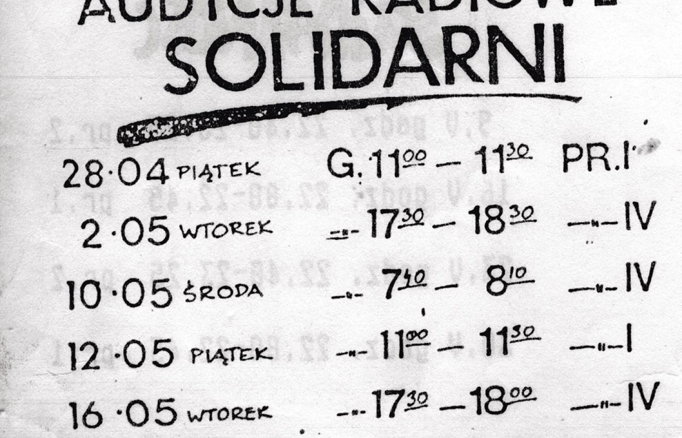 Pierwszą audycję podziemnego Radia Solidarność wyemitowano 12 kwietnia 1982 r., w drugi dzień świąt wielkanocnych na warszawskiej Ochocie. „Staliśmy na dachu wieżowca w śródmieściu Warszawy. Wkoło nas fantastyczny widok – setki tysięcy świateł, aż po niewidoczny w ciemności horyzont. Punktualnie o wyznaczonej porze (chyba była to godzina 21) pełni emocji włączamy nadajnik i magnetofon z nagraniem audycji. Jeden z nas trzyma w wyciągniętej ręce antenę, drugi stoi o kilka kroków dalej z radioodbiornikiem kontrolnym. I wielka ulga: nadajnik »zagrał«. Słyszymy »fifulki« [melodię okupacyjnej piosenki „Siekiera, motyka...” – G.M.] – sygnał rozpoznawczy i pierwsze zdania audycji. Bo tego najbardziej w głębi duszy obawialiśmy się, choć nikt tego głośno nie wypowiadał: żeby nieprzewidziana awaria techniczna nie zniweczyła naszych żmudnych, wielotygodniowych prób i przygotowań i nie sprawiła gorzkiego zawodu tysiącom naszych słuchaczy. W połowie programu pauza, przed którą prosiliśmy słuchaczy, aby potwierdzili słyszalność audycji mruganiem świateł. I oto przed naszymi oczami rozmigotała się cała Warszawa, aż po najdalsze krańce. W pobliskich domach otwierały się okna, ludzie wybiegali na balkony, wydawali tryumfalne okrzyki. Niełatwo ulegam wzruszeniom, ale w tym momencie miałem gardło ściśnięte i łzy w oczach. To była najpiękniejsza chwila w moim życiu” – wspominał Janusz Klekowski, który emitował ją wraz z Markiem Rasińskim.