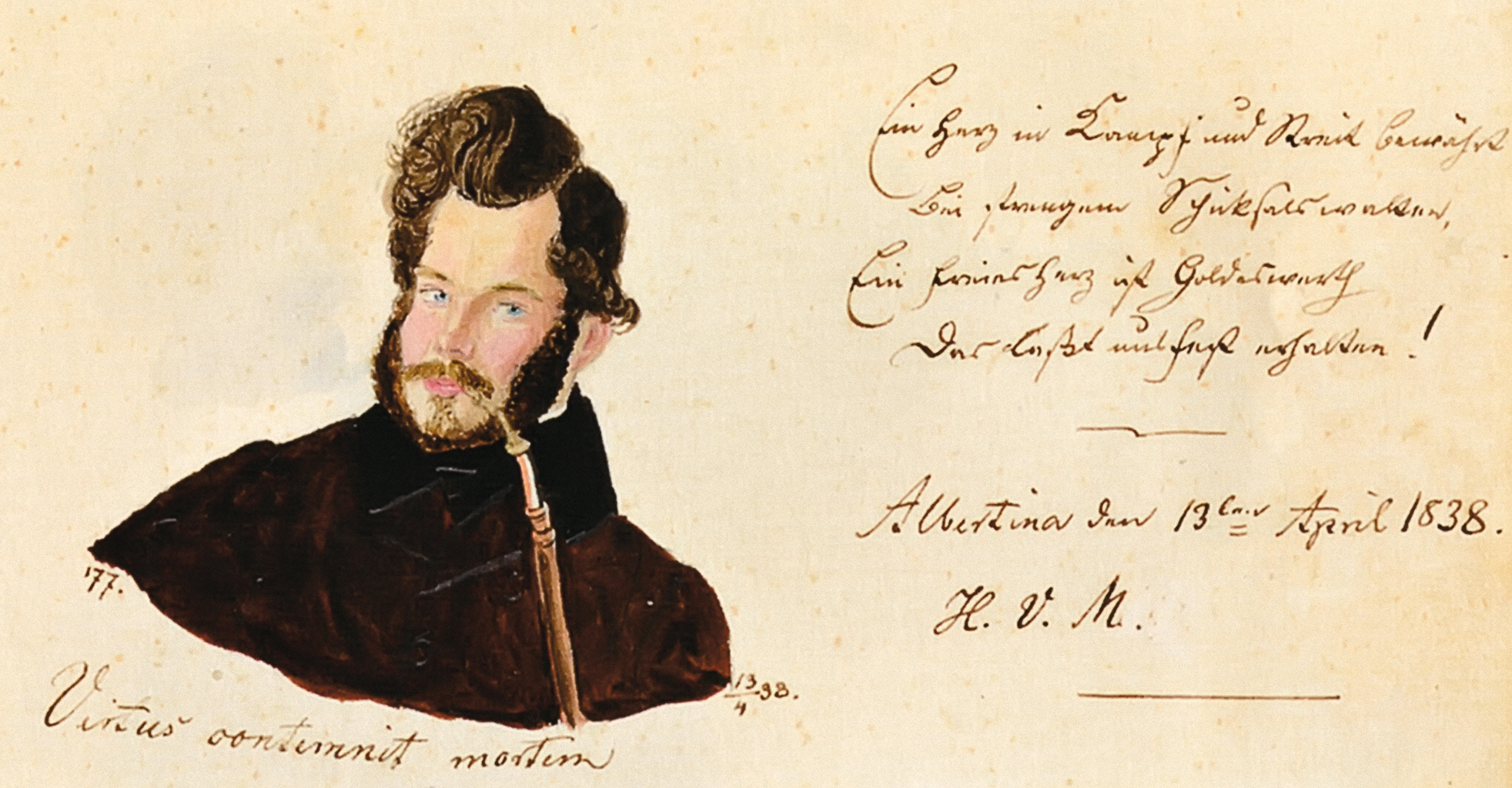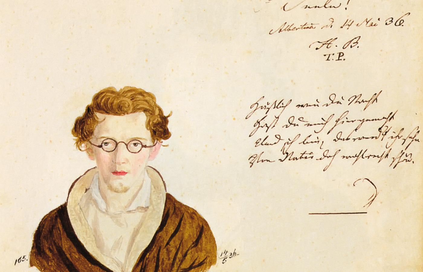 Wilhelm Schmiedeberg urodził się w Królewcu w 1815 r. jako syn aptekarza. W dzieciństwie przeszedł jakąś chorobę (albo miał wypadek), bo całe życie chodził o kulach. Był uzdolniony plastycznie i w gimnazjum pobierał lekcje rysunku, ale nie wyjechał z rodzinnego miasta studiować sztukę, tylko tam skończył prawo i filozofię. Pewnie nigdy byśmy o nim nie usłyszeli, gdyby przez cały pobyt na królewieckiej uczelni (1835–39) nie prowadził albumu, w którym zamieszczał portrety akademickich kolegów, informacje o tym, skąd pochodzili, do jakiego bractwa należeli. Wielu z nich wpisało się przy swojej podobiźnie. Zazwyczaj są to krótkie wyrazy przyjaźni i pamięci, aluzje do wspólnie spędzonych chwil w królewieckich knajpach oraz cytaty starogreckie i łacińskie czy fragmenty utworów niemieckich klasyków.