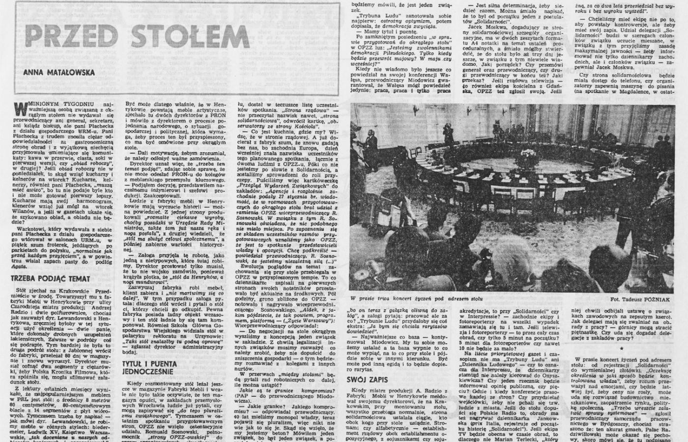 Kiedy mistrz produkcji A. Radzio z Fabryki Mebli w Henrykowie meldował swojemu dyrektorowi, że na Krakowskim, przy montowaniu stołu, wszystko przebiega normalnie, strona solidarnościowa ustalała ciągle, kto obok kogo przy stole usiądzie. Stronami czy alfabetycznie – establishment rządowy obok establishmentu opozycyjnego, z sojusznikami czy sojusznicy establishmentów osobno?