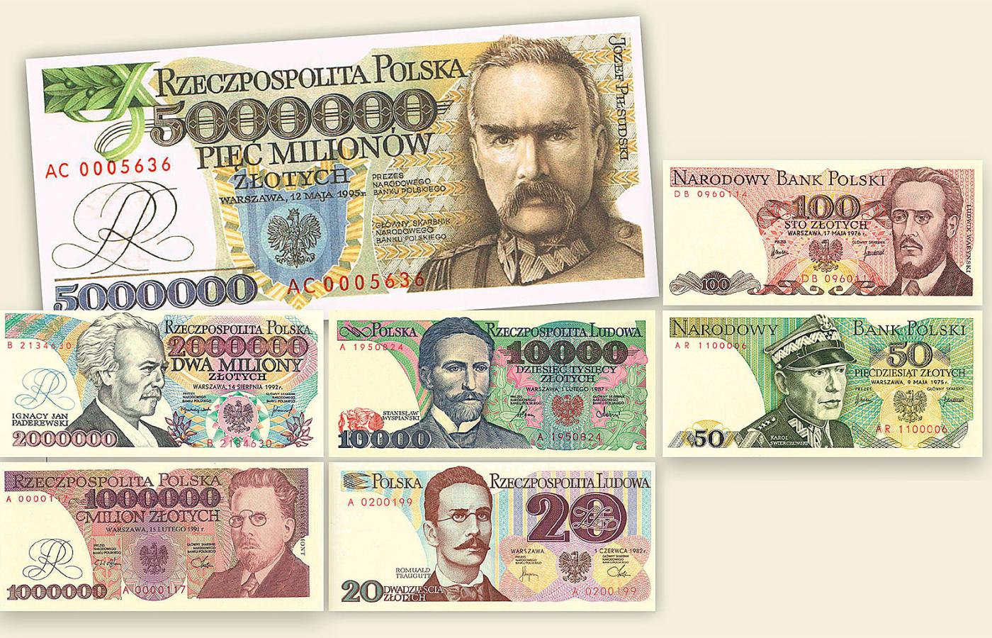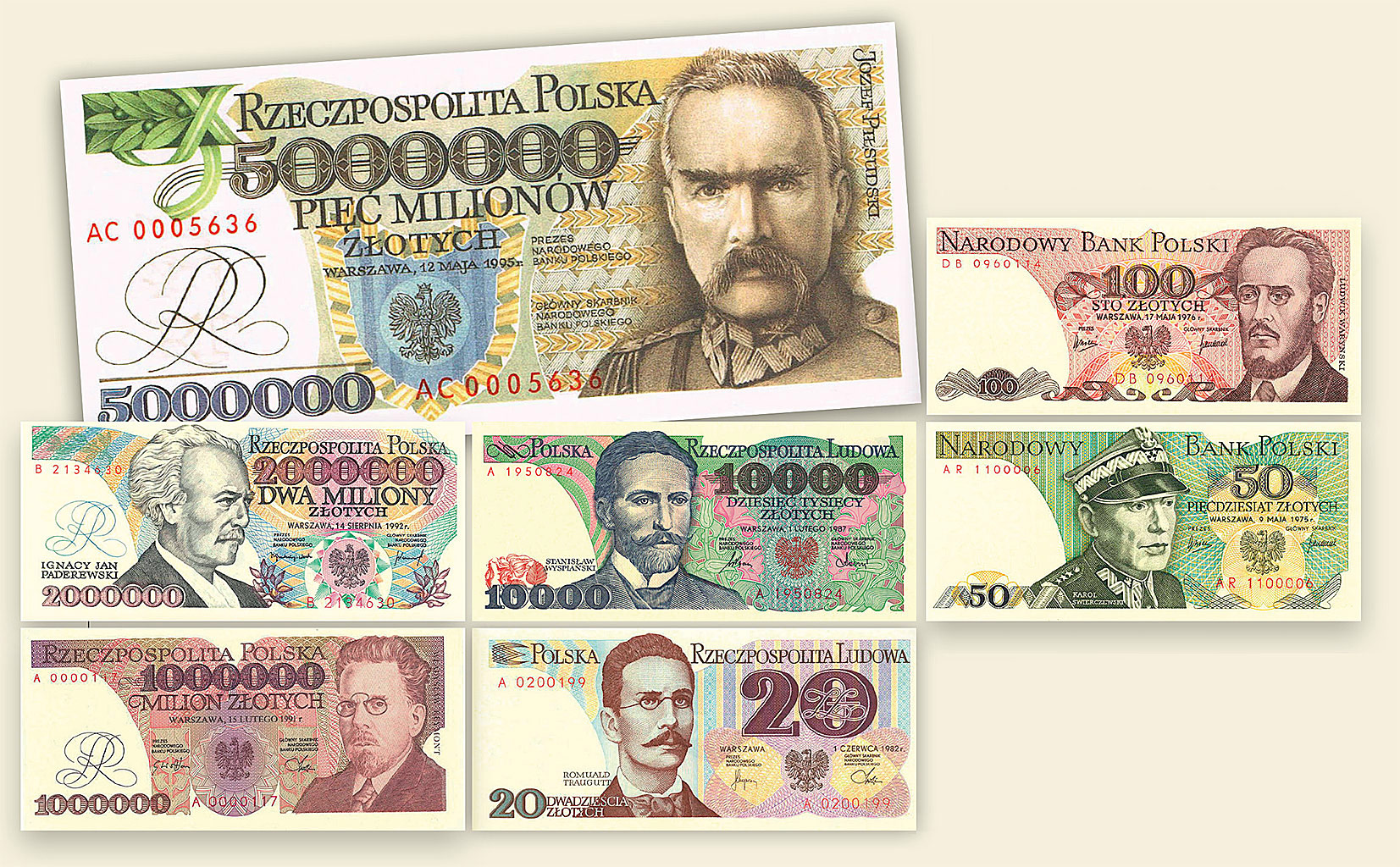 Andrzej Heidrich, najsłynniejszy polski twórca banknotów, kontynuował więc swoją serię z PRL, dodając nowych bohaterów: Moniuszkę (100 tys. zł), Sienkiewicza (500 tys. zł), Reymonta (1 mln zł) i Paderewskiego (2 mln zł). W 1994 r. gotowy był banknot 5 mln zł z wizerunkiem Piłsudskiego. Marszałek jednak nie doczekał już wejścia do obiegu.