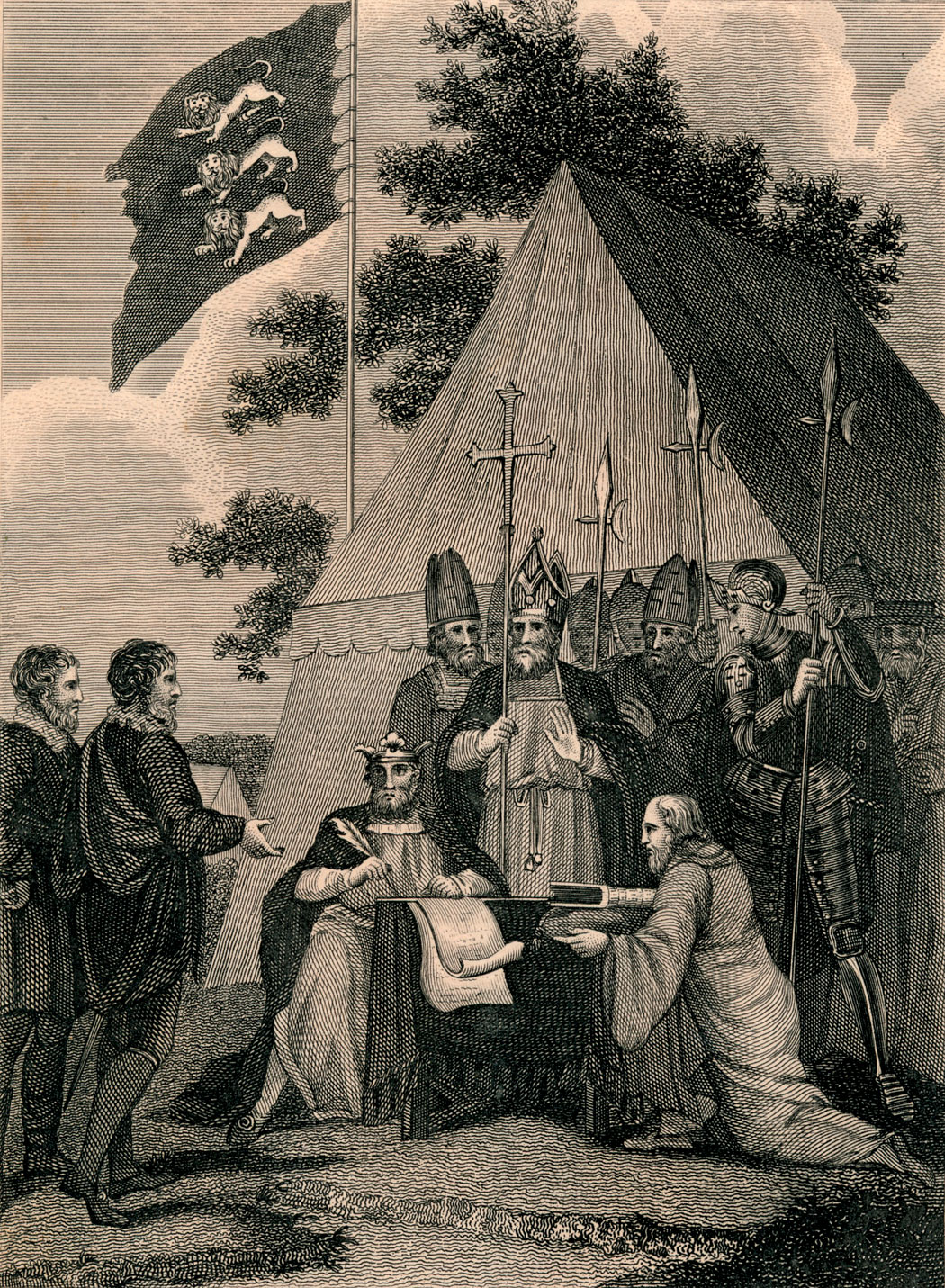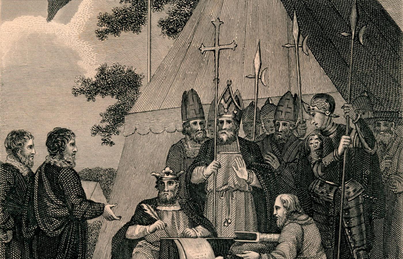 Wiosną 1215 r. królestwo Anglii było w ogniu wojny domowej. Zbuntowani przeciw monarchii baronowie właśnie zdobyli Londyn. Król Jan Bez Ziemi musiał prosić buntowników o pokój. 15 czerwca wraz z całym dworem stawił się w miejscu zwanym Runnymede, by podpisać zawieszenie broni, które przejdzie do historii jako Magna Charta Libertatum (Wielka Karta Swobód). Był to najbardziej upokarzający dzień w jego życiu.