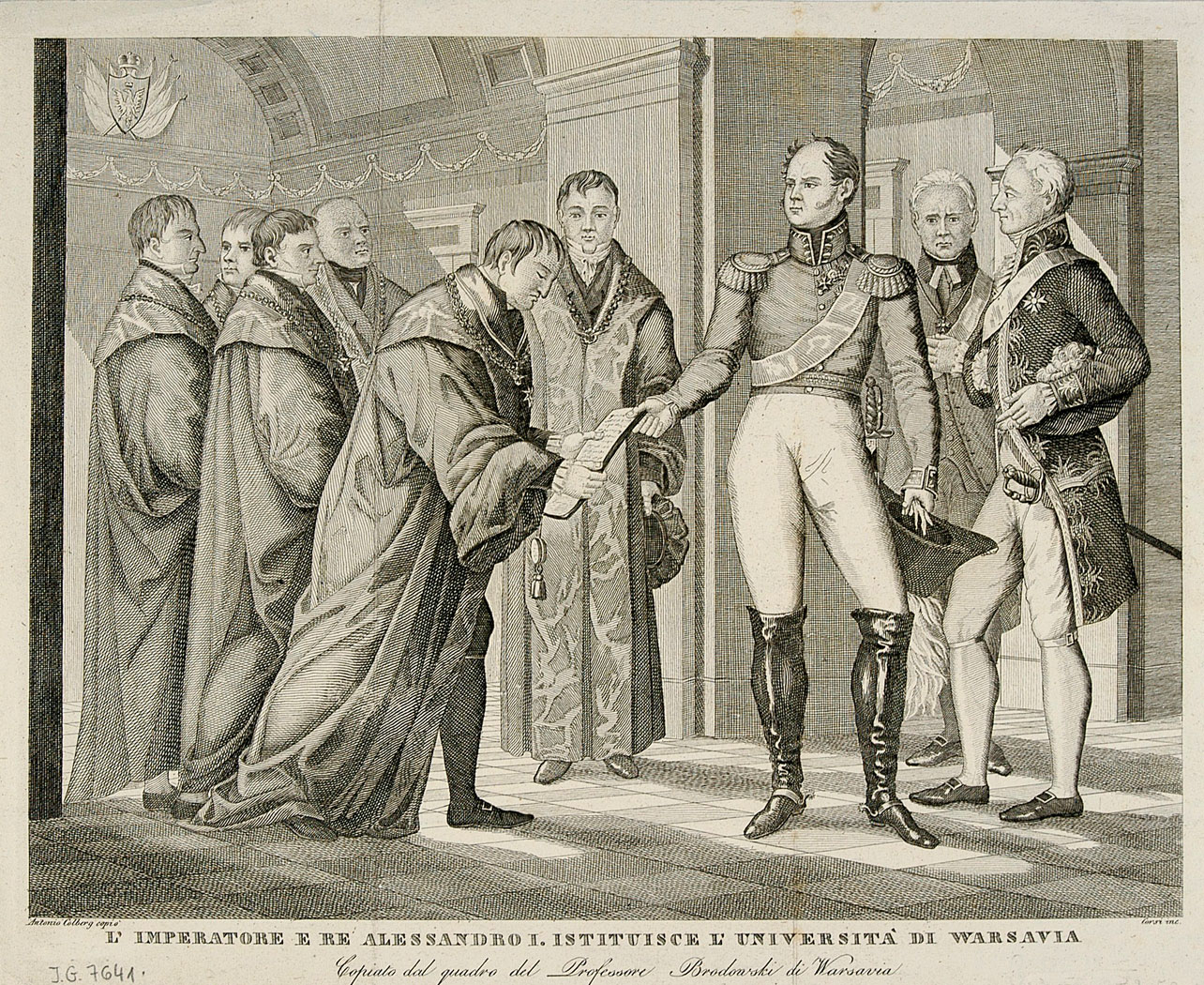 Imperator Wszechrusi i król Polski Aleksander I wydał 19 listopada 1816 r. „Najwyższy dyplom” tworzący Uniwersytet Królewsko-Warszawski: „Lubo znaleźliśmy w Królestwie Polskim rozszerzone światło nauk przez zaprowadzane w niem rozmaite szkoły i instytuta naukowe; jednak w troskliwości statecznej o dobro poddanych naszych, chcąc do najwyższego naukowego stopnia doprowadzić oświecenie narodowe, przedsięwzięliśmy ustanowić Szkołę Główną, w której młodzież nabywając wiadomości w szczególnych umiejętnościach, stosownie do swych zdolności i przyszłego poważania, usposabiałaby się na pożytecznych krajowi sług i obywateli”.