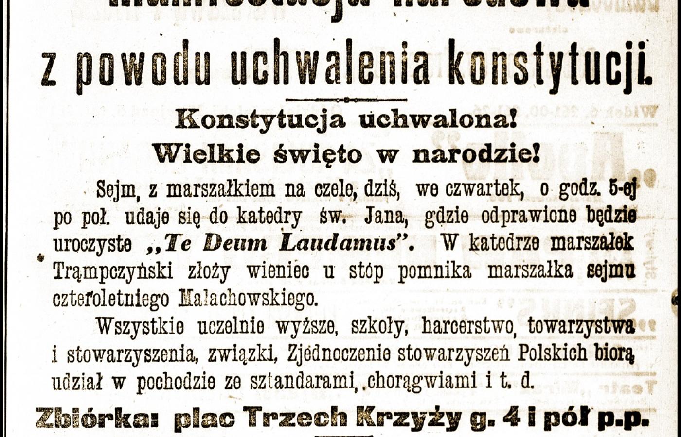Trotuary przepełnione były publicznością, balkony i okna zasiane tysiącami głów. Co chwila rozbrzmiewały okrzyki: „Niech żyje Konstytucja!”, „Niech żyje Sejm!”, „Niech żyje Marszałek Trąmpczyński!”, „Niech żyje Naczelnik Państwa!”, „Niech żyje Rząd!”. Podejmowały je natychmiast nieprzebrane tłumy ze wszystkich warstw społecznych. Okrzyki mieszały się ciągle z dźwiękami muzyki orkiestr, które grały ciągle pieśni narodowe. [...] Długo jeszcze na mieście trwały pochody i manifestacje ogólne.