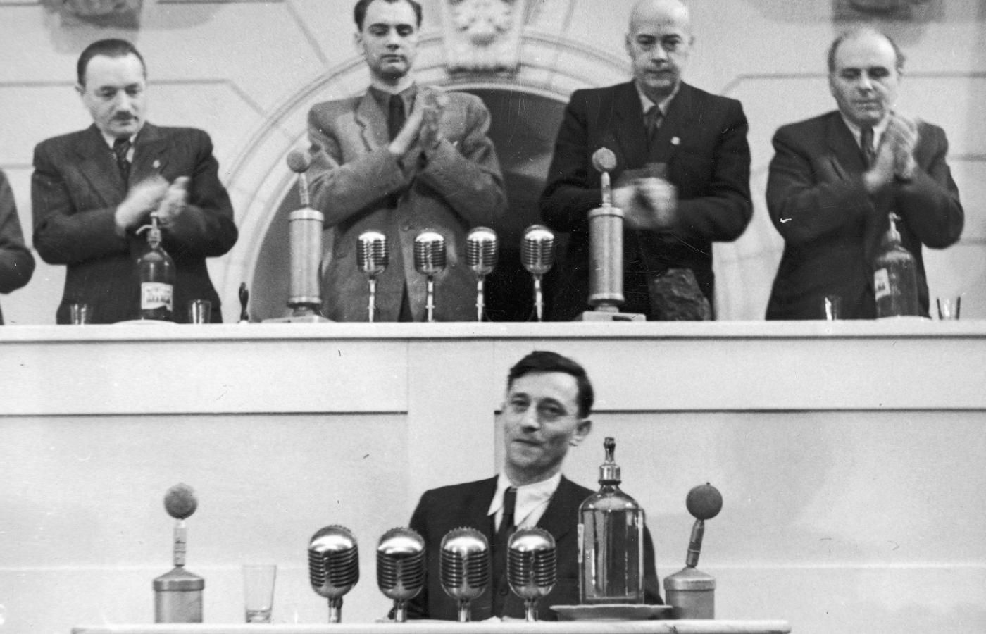 Bolesław Bierut (sekretarz generalny KC PPR) w przemówieniu podczas wspólnego posiedzenia KC PPR i Centralnego Komitetu Wykonawczego PPS