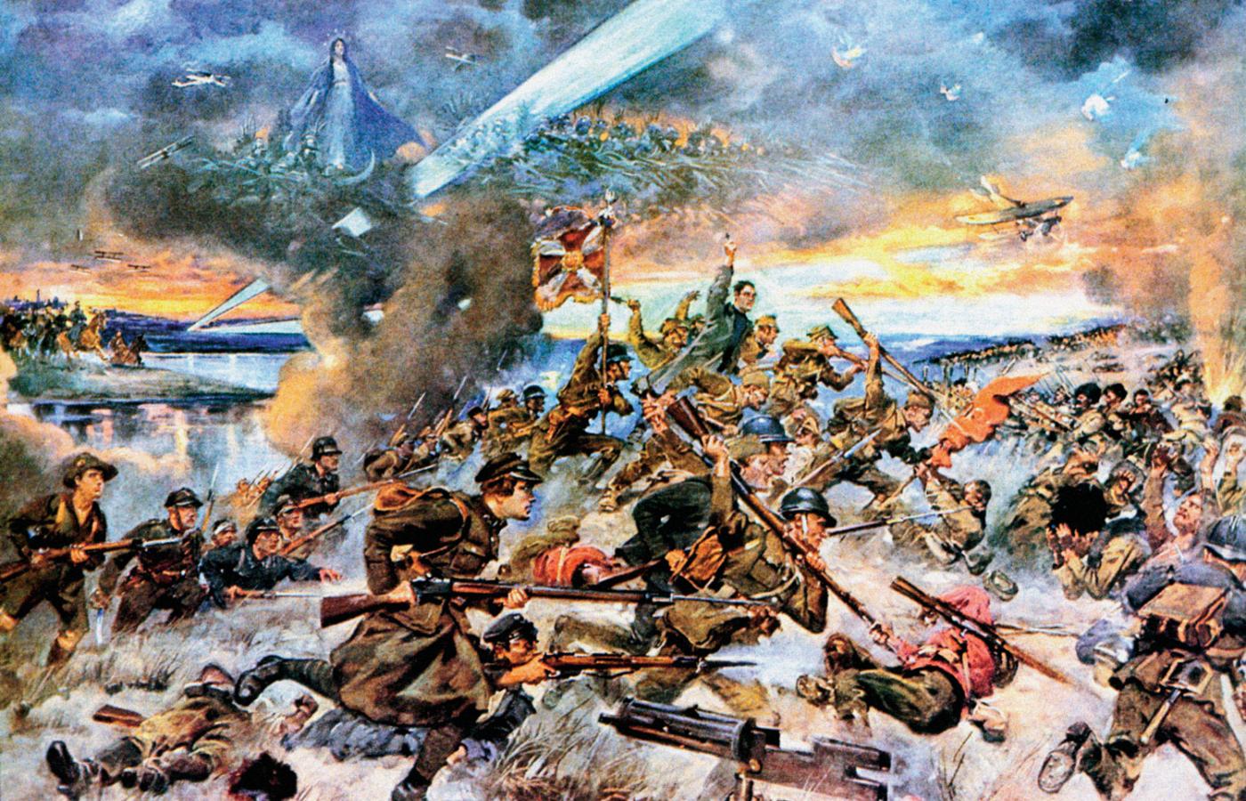Wróćmy jednak do zabiegu autorów podręcznika: wątpliwą ocenę podają oni uczniom jako fakt historyczny, zinterpretowany w religijno-nacjonalistycznym duchu. Poniżej reprodukują przy tym obraz Jerzego Kossaka „Cud nad Wisłą”, straszliwy kicz, na którym Matka Boska w promieniach światła płynącego z chmur i z pomocą zastępów anielskich pozwala Polakom pokonać czerwone azjatyckie hordy.
