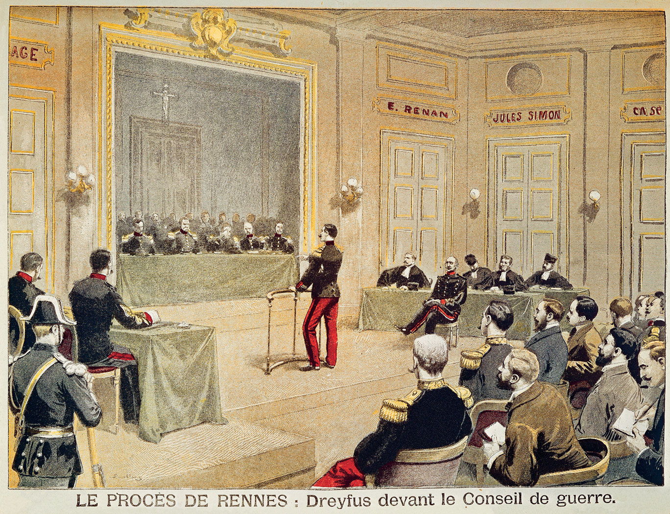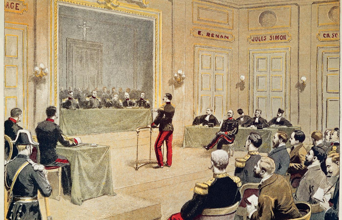 Jesienią 1894 r. w ręce francuskiego wywiadu wojskowego wpadł odpis tajnego dokumentu wojskowego przekazanego przez nieznaną osobę niemieckiej ambasadzie w Paryżu. Podejrzenie o szpiegostwo wkrótce padło na Dreyfusa, a podobieństwo pisma uznano za wystarczający powód, by skierować sprawę do nadzwyczajnego sądu wojskowego. Na podstawie wątpliwych poszlak, a przede wszystkim sfałszowanych przez oficerów wywiadu dokumentów Dreyfus został uznany za winnego, zdegradowany i skazany na dożywocie na Diabelskiej Wyspie, szczególnie ciężkiej kolonii karnej w Gujanie Francuskiej. 5 stycznia 1895 r. doszło do publicznej degradacji, a wydarzeniu towarzyszyły antyżydowskie demonstracje podsycane przez prawicową i antysemicką prasę.