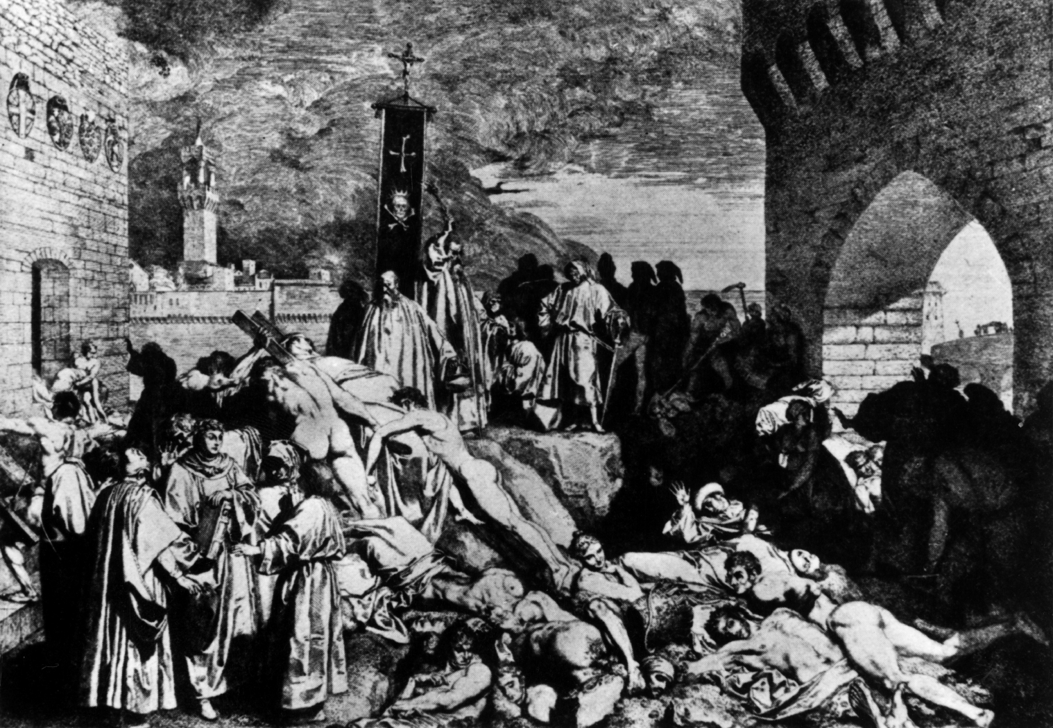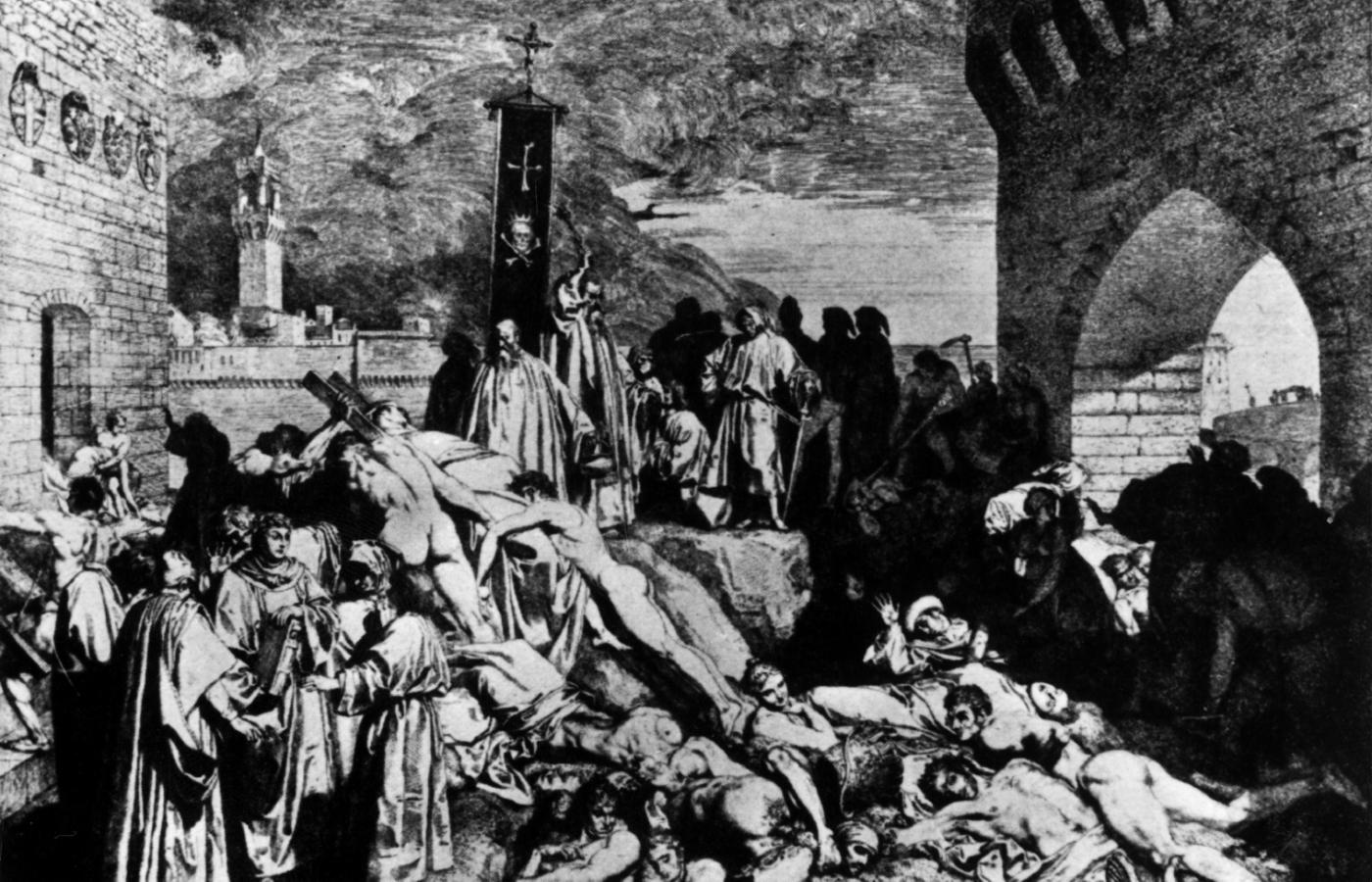 Państwo, dopóki działało, również próbowało przeciwdziałać, płacąc lekarzom (byle jaki medyk otrzymywał w tym czasie we włoskim mieście roczne wynagrodzenie wysokości 200 florenów), organizując kwarantanny, wywóz zwłok, miejsca masowych pochówków, blokując kordonami granice – wszystko na próżno. Ciekawym przykładem reakcji na zarazę był eskapizm, opisywany przez Boccaccia w „Dekameronie” (można powiedzieć, że „na bieżąco”, bo dzieło zostało ukończone już w 1353 r.). I tak doszliśmy do Florencji, która udzieli nam interesującej egzemplifikacji.